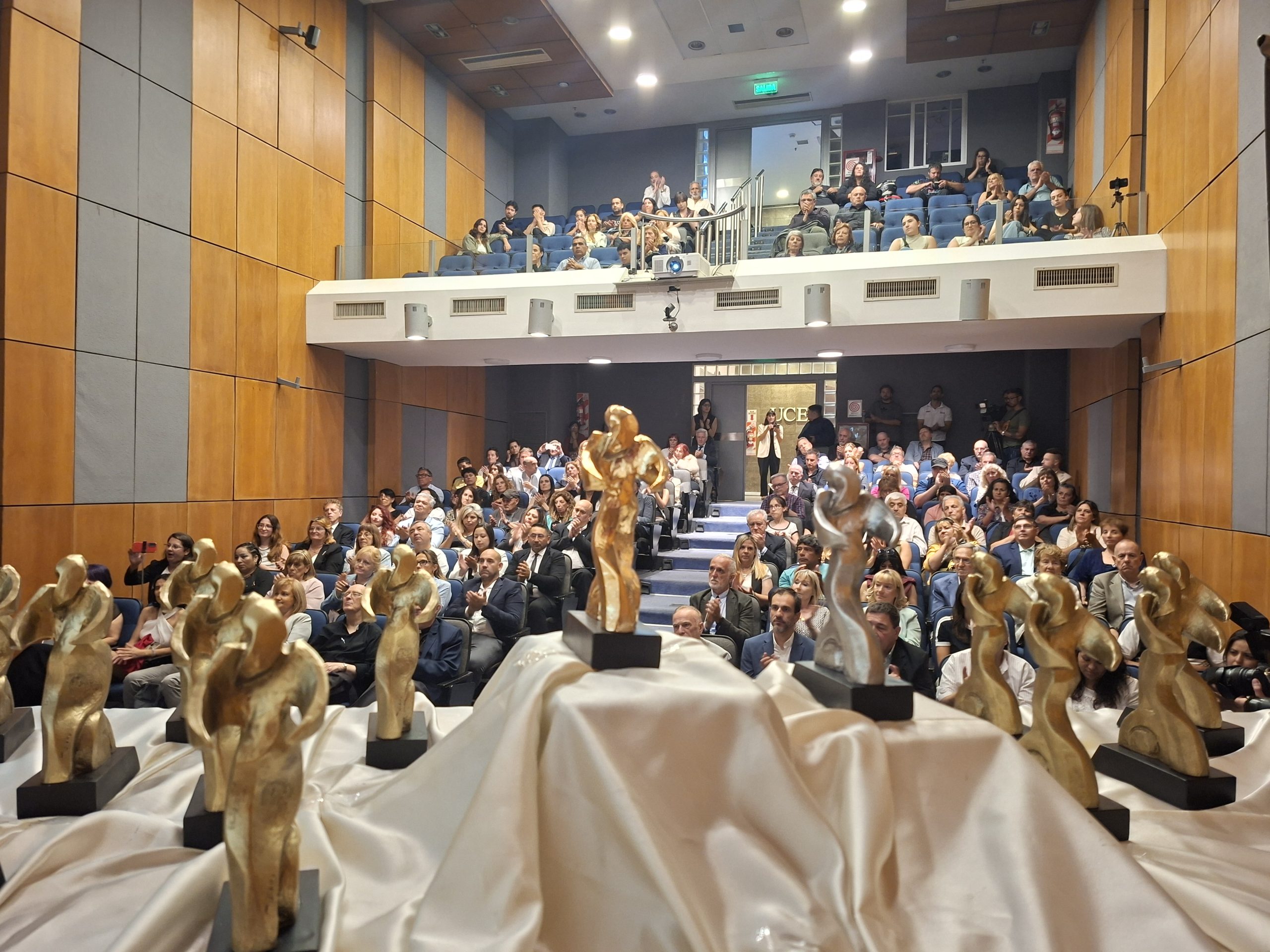 Los premios esperando el momento de la entrega en el auditorio de la UCEMA.