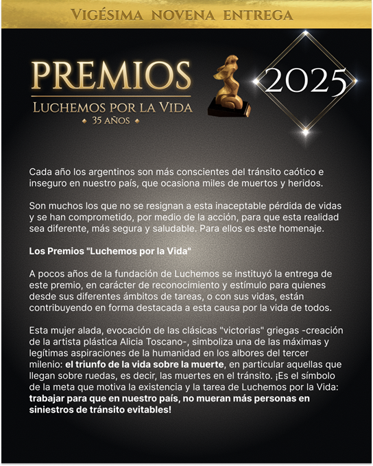«Luchemos por la Vida es una organización no gubernamental sin fines de lucro cuyo propósito es prevenir los siniestros de tránsito en nuestro país», explica la web de la asociación, que detalla la naturaleza, los objetivos, las áreas de trabajo y más aspectos generales. «Estos hechos son la causa de casi 17 muertos por día (cerca de 6.000 al año), más de 120.000 heridos por año y grandes pérdidas materiales (estimadas en U$S 10.000 millones por año). Cifras muy altas comparando con las de países desarrollados, que son ocho veces más bajas (considerando cantidad de vehículos en circulación)».