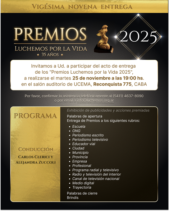 Carlos Clérici suma 35 años como voz institucional de la Asociación Civil Luchemos por la Vida. Por eso, María Cristina Isoba, presidenta de la asociación civil que da nombre a los galardones, le entregó una estatuilla de oro, que el locutor recibió junto a Alejandra Zúccoli, su esposa y colaboradora profesional. En simultáneo, como es habitual cada temporada, ambos actuaron como maestros de ceremonias de una cita emotiva y variada, que convocó a argentinos de diferentes orígenes y rubros. El convite se llevó a cabo el 25 de noviembre en el auditorio de la UCEMA, Reconquista 775, Capital Federal.