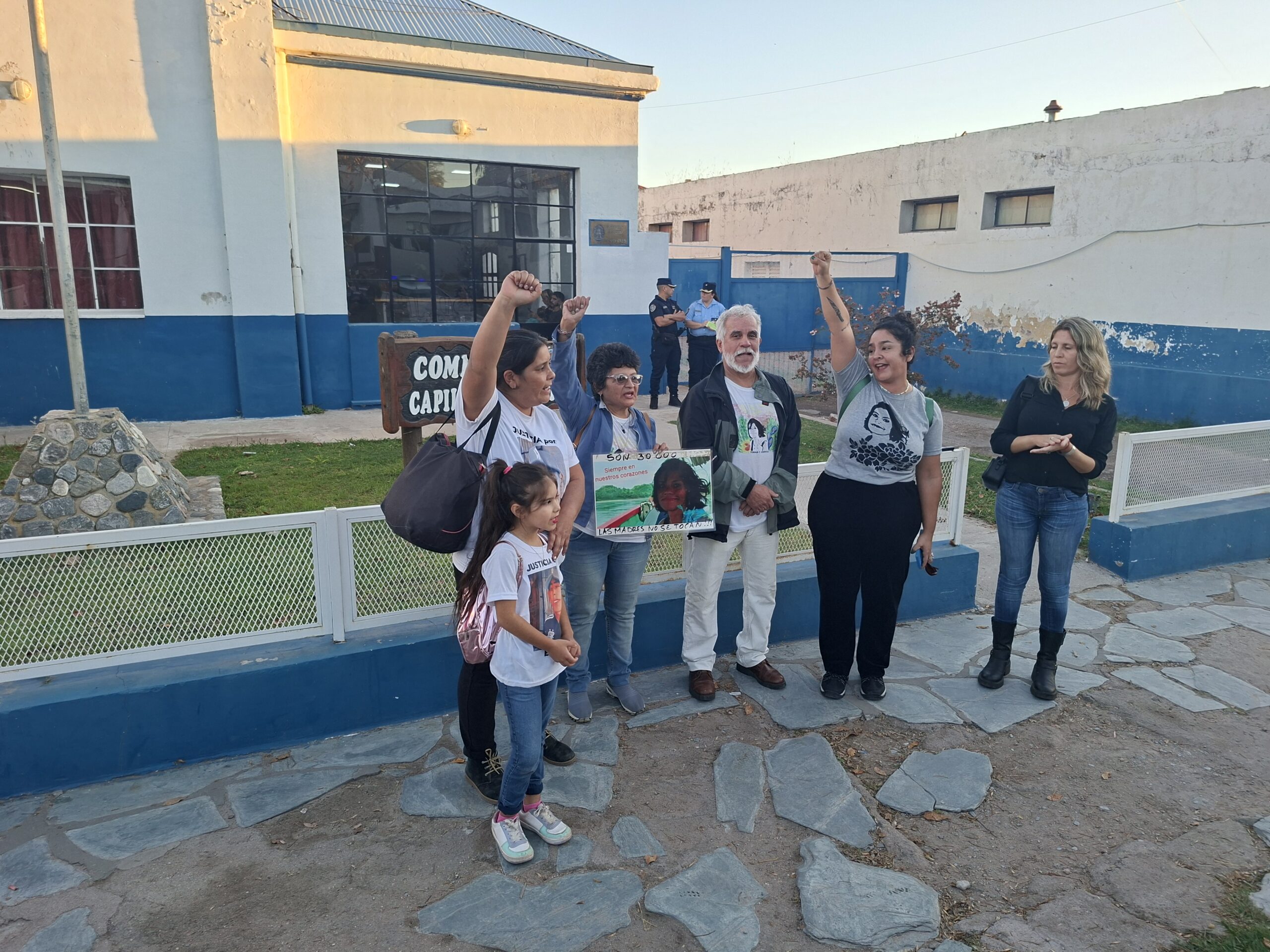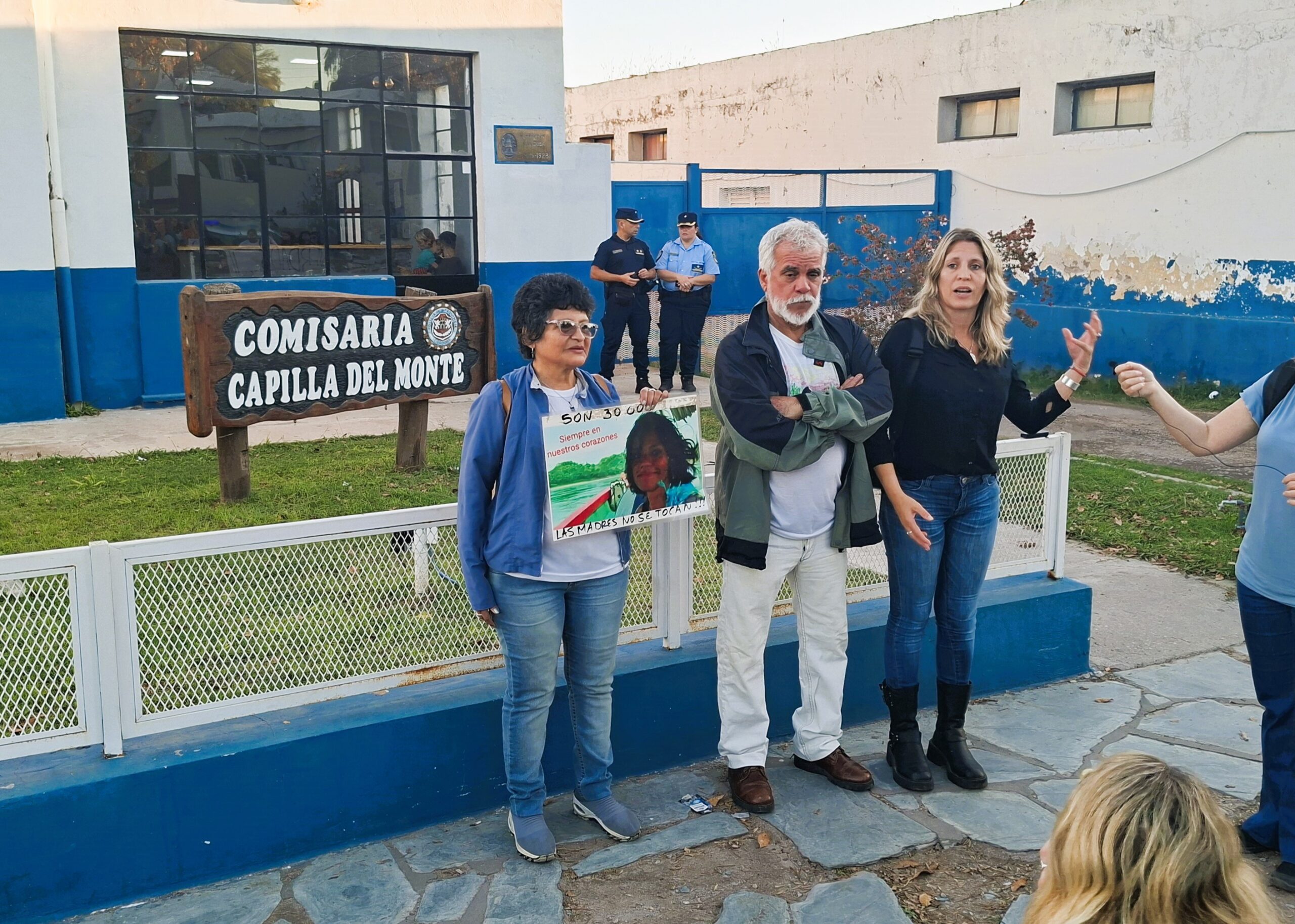 «Invitamos a la abogada que nos acompaña», anuncia Alberto Daniel Basaldúa, que junto a su mujer Susana Reyes acaba de hablar a la multitud, parados ambos en la vereda de lajas mirando hacia la calle. «Bueno, gracias a todos», interviene Daniela Pavón, ubicándose a mano izquierda del hombre, el lado opuesto que la esposa. «Comisaría Capilla del Monte», puede leerse a espaldas de los tres un cartel de madera artesanal, en caracteres blancos sobre fondo barnizado. El letrero tiene un metro de altura y se encuentra a cierta distancia, erguido sobre dos troncos enterrados en la gramilla.