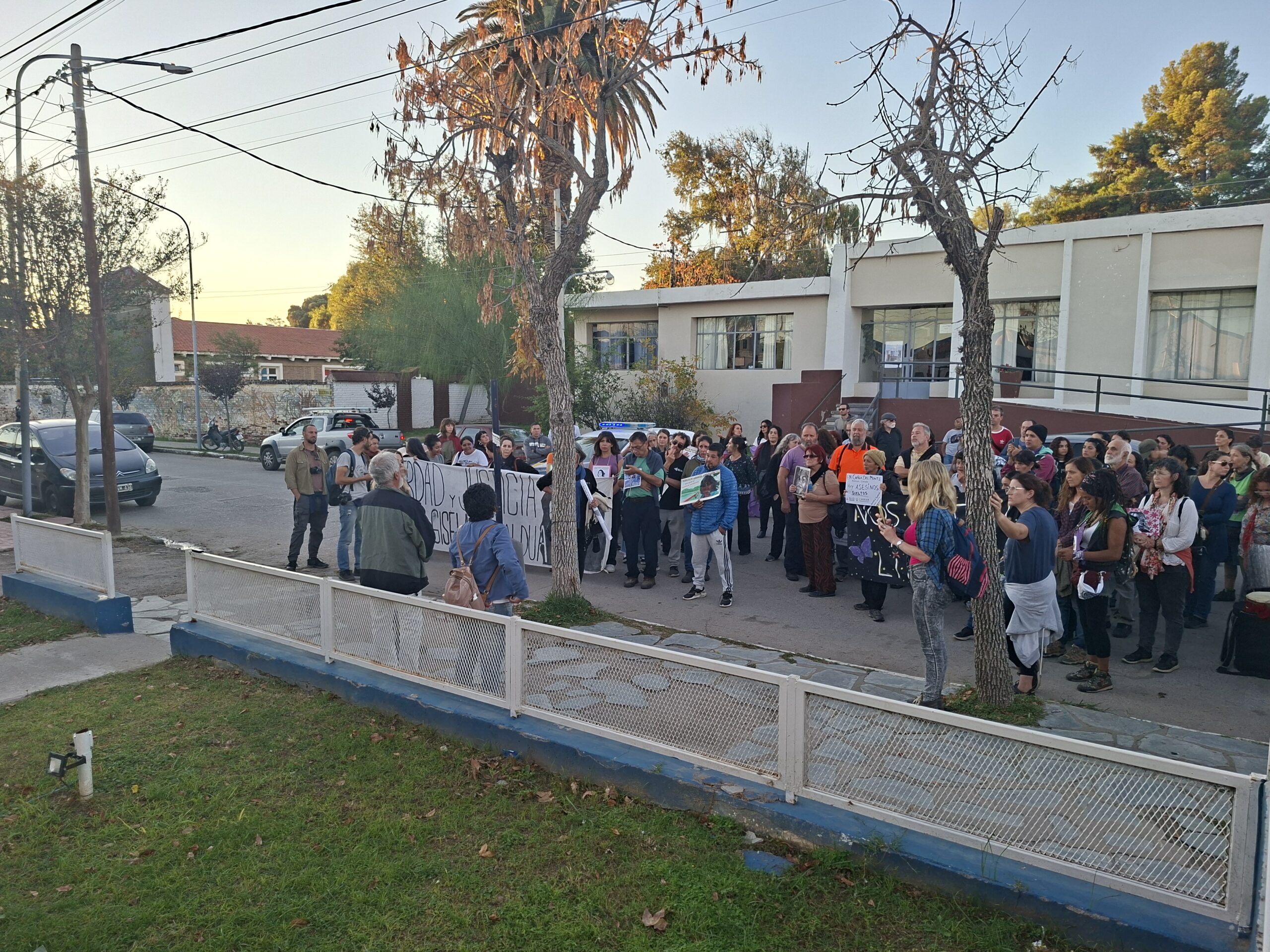 «Básicamente, estar acá es como lo que representa para nosotros toda esta causa», escruta la representante legal (su voz abarca los minutos 14 a 19 del audio de esta nota); «porque de acá surgió todo lo que pasó, las irregularidades, lo que como familia ellos han tenido que pasar». Es el atardecer del 25 de abril. Dos policías, una mujer y un hombre, observan parados cerca de un portón azul. Los ciudadanos enfrentados a los oradores suman un par de centenares y permanecen detrás de una pancarta blanca con el rostro de la víctima que parece debatir con el rótulo de madera: «Verdad y justicia; Cecilia Gisela Basaldúa».