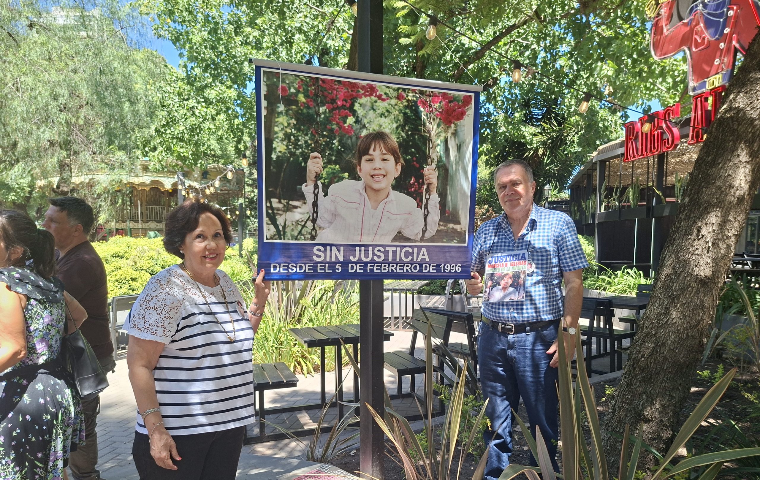 Los padres de Marcela junto a una pancarta expuesta en el 30 aniversario.