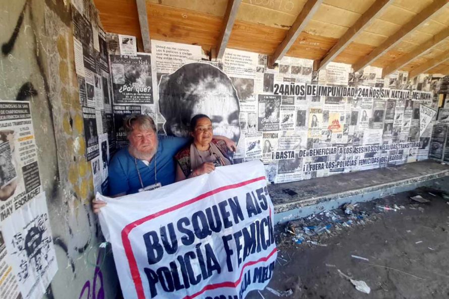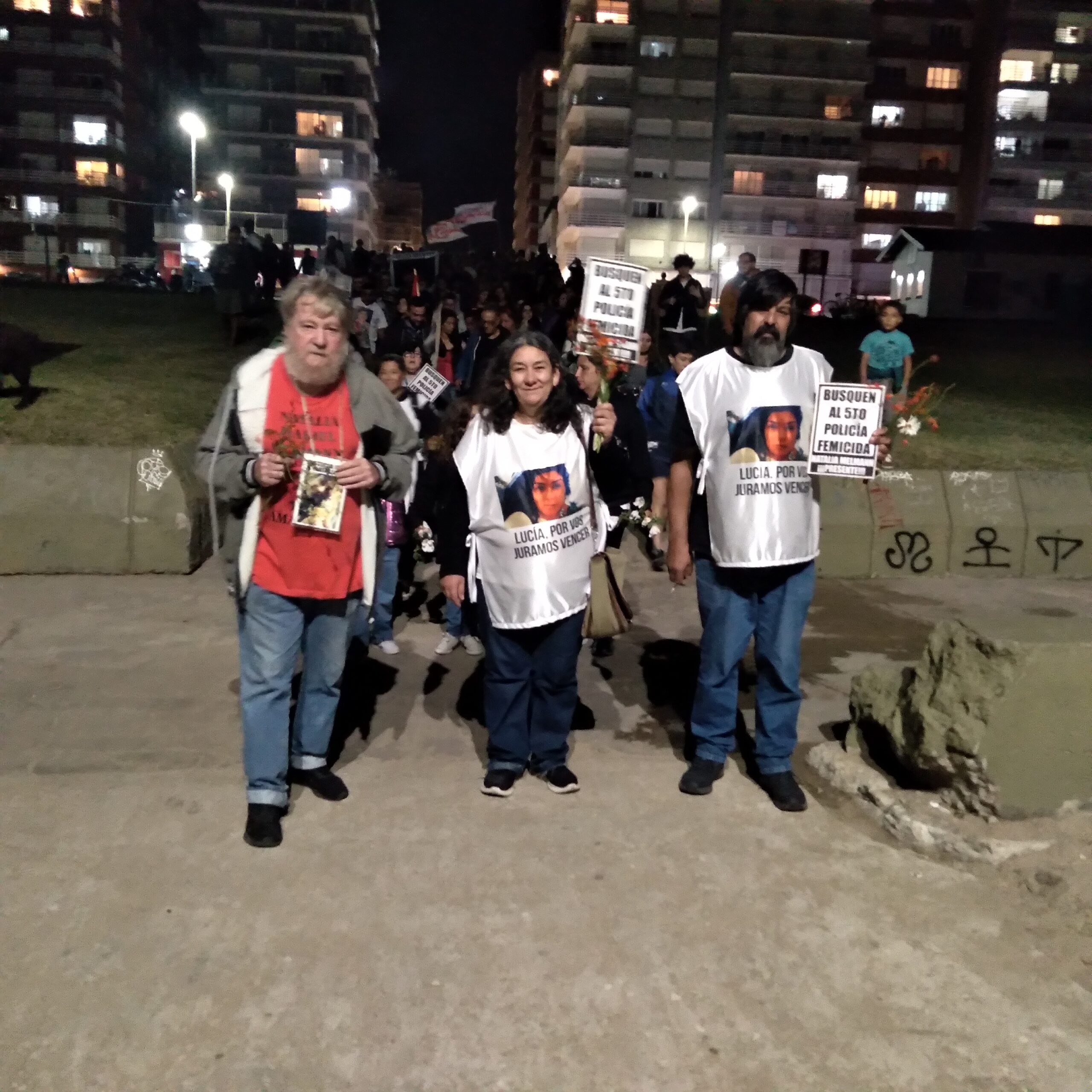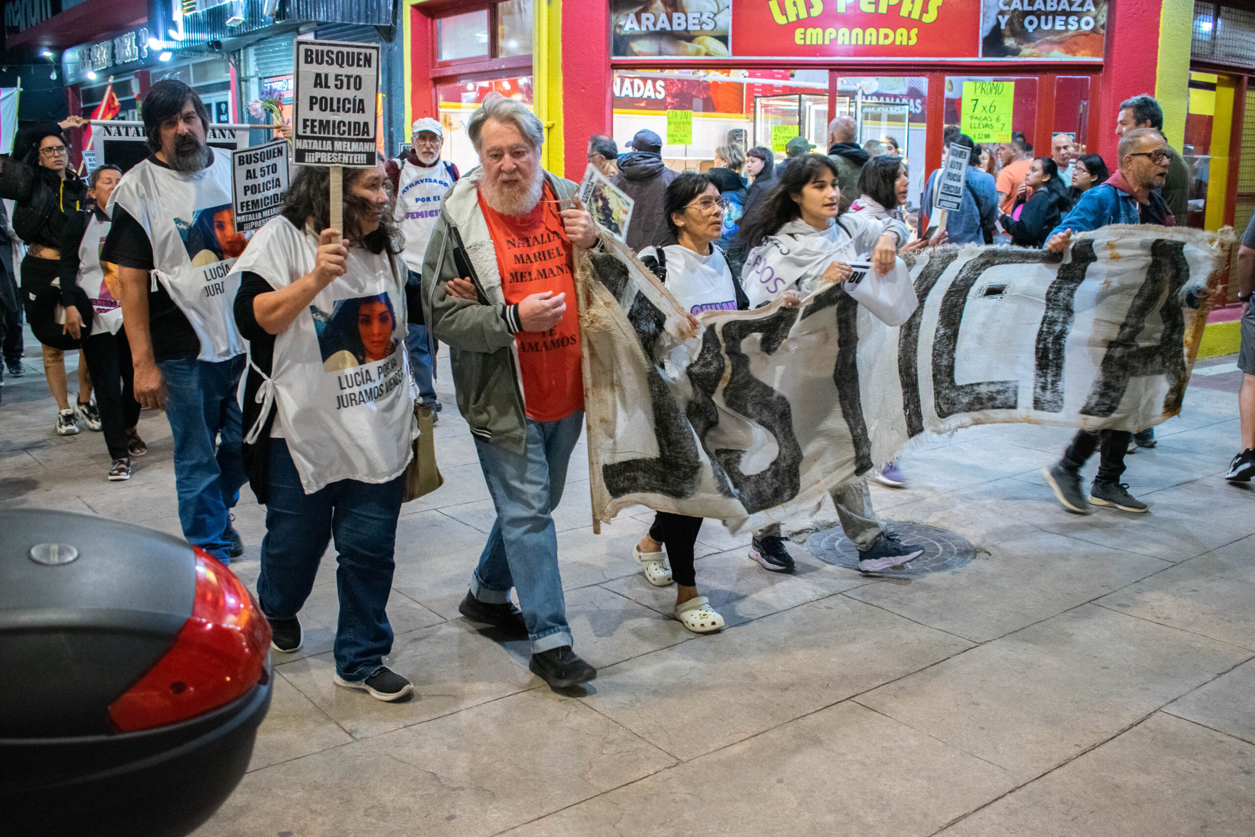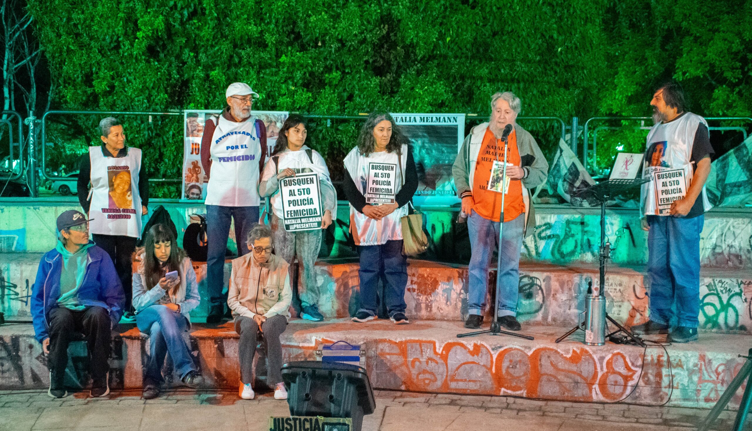 Sopla una brisa fresca y persistente. La barba y el abundante pelo blanquecinos del papá brillan por efecto de las luces del anfiteatro, constituido por tres escalones de cemento que rodean un playón circular. El orador luce pantalón de jean, remera roja y campera gris de algodón. «Natalia Mariel Melmann te amamos», se lee en el pecho con caracteres negros sobre la camiseta colorada. A continuación tomarán la palabra Laura Calampuca, mamá de la víctima; Nahuel, hermano; Marta y Guillermo, padres de Lucía Pérez; Manuel Iglesias, hermano de Laura; y Daira Sayavedra, hija de Sabrina González; entre otros.