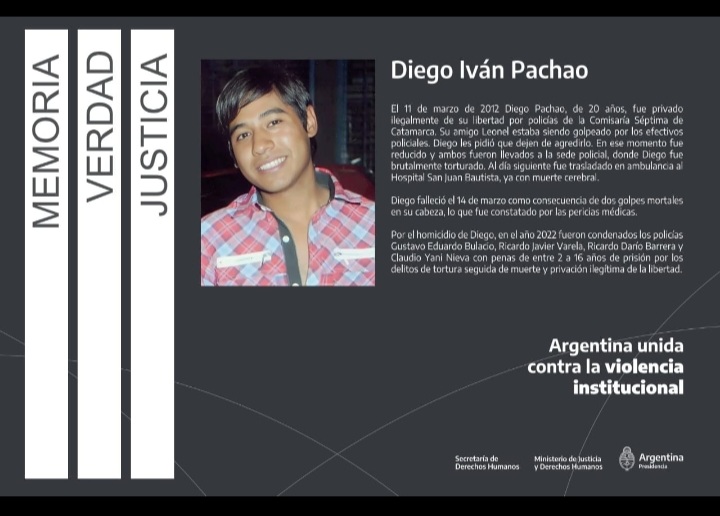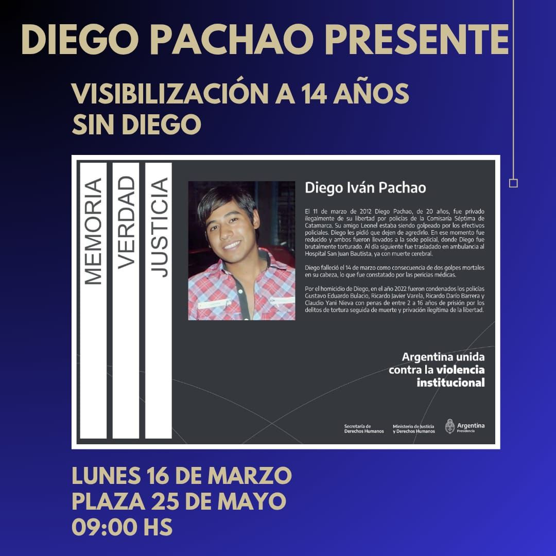«La ley 26.811, artículo 3 [sancionada por el Congreso Nacional en 2012], avala la cartelería por crímenes de lesa humanidad para que sea un nunca más», continúa ella en Facebook. «Este 14 de marzo se cumplen 14 años de ese maldito día en que me arrancaron a mi ángel Diego. Por tal motivo presentamos nuevamente notas para que se nos autorice ese día el acto y posterior colocación del cartel. Tengan a bien ayudarnos y que se realice esto con lo que venimos lidiando desde tantos años. Por la memoria, verdad y justicia. Por mi hijo Diego Iván Pachao. Agradeceré puedan ayudarme a difundir».