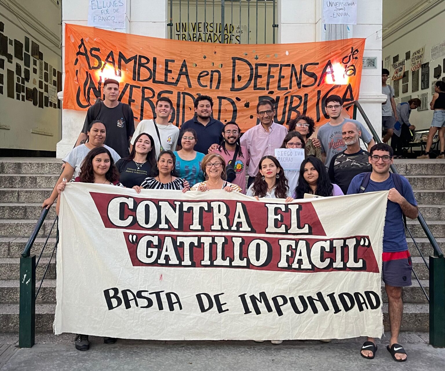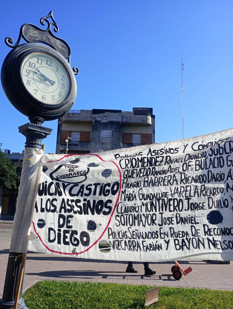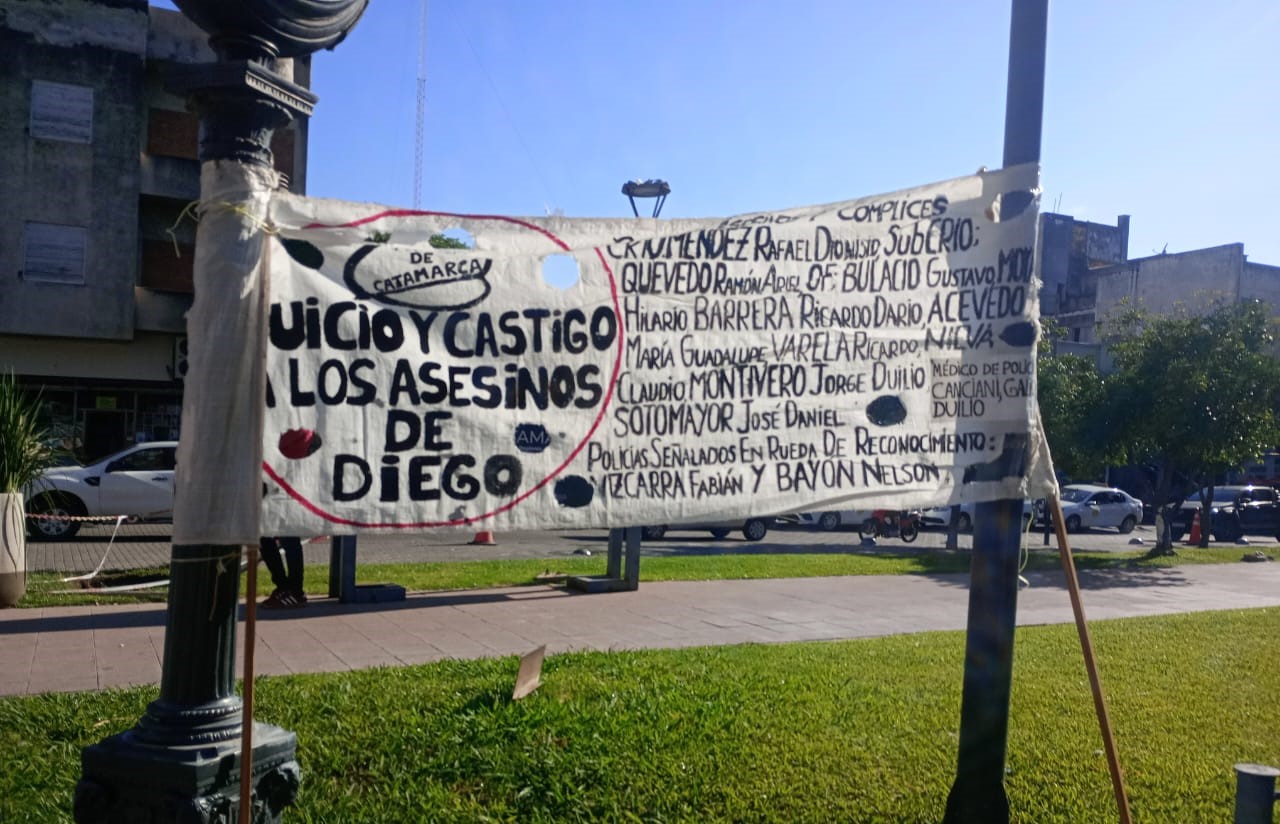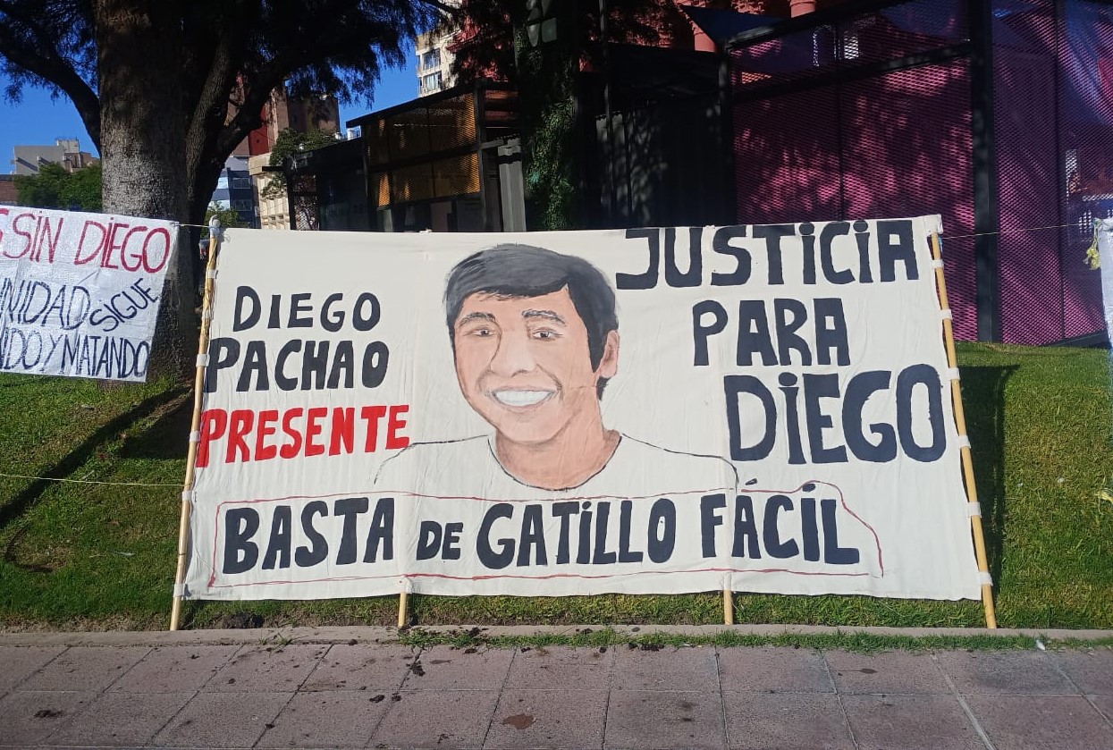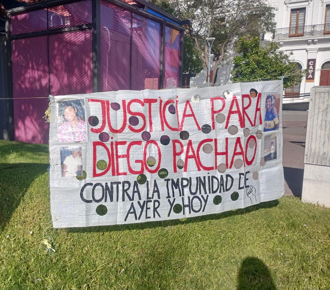 El rosado intenso de los muros y las columnas de la Catedral le da un toque pintoresco al fondo de la escena. Aledaño está el edificio de la Gobernación, con sus dos niveles de ventanales, frente blanco inmaculado y arquitectura colonial. «Diego Pachao presente», proclama en letras negras y rojas pintadas a mano una pancarta blanca con el rostro del joven; «basta de gatillo fácil», exige. «Juicio y castigo a los asesinos de Diego», pretende otro cartel de diseño similar, que nombra a los 13 efectivos acusados por el homicidio. Es una mañana estupenda. El sol inunda el área con sus rayos enérgicos.