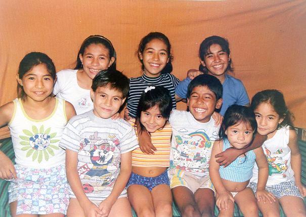 Los nueve hijos de Claudia Véliz. Diego ríe abrazando a Florencia y Yael.