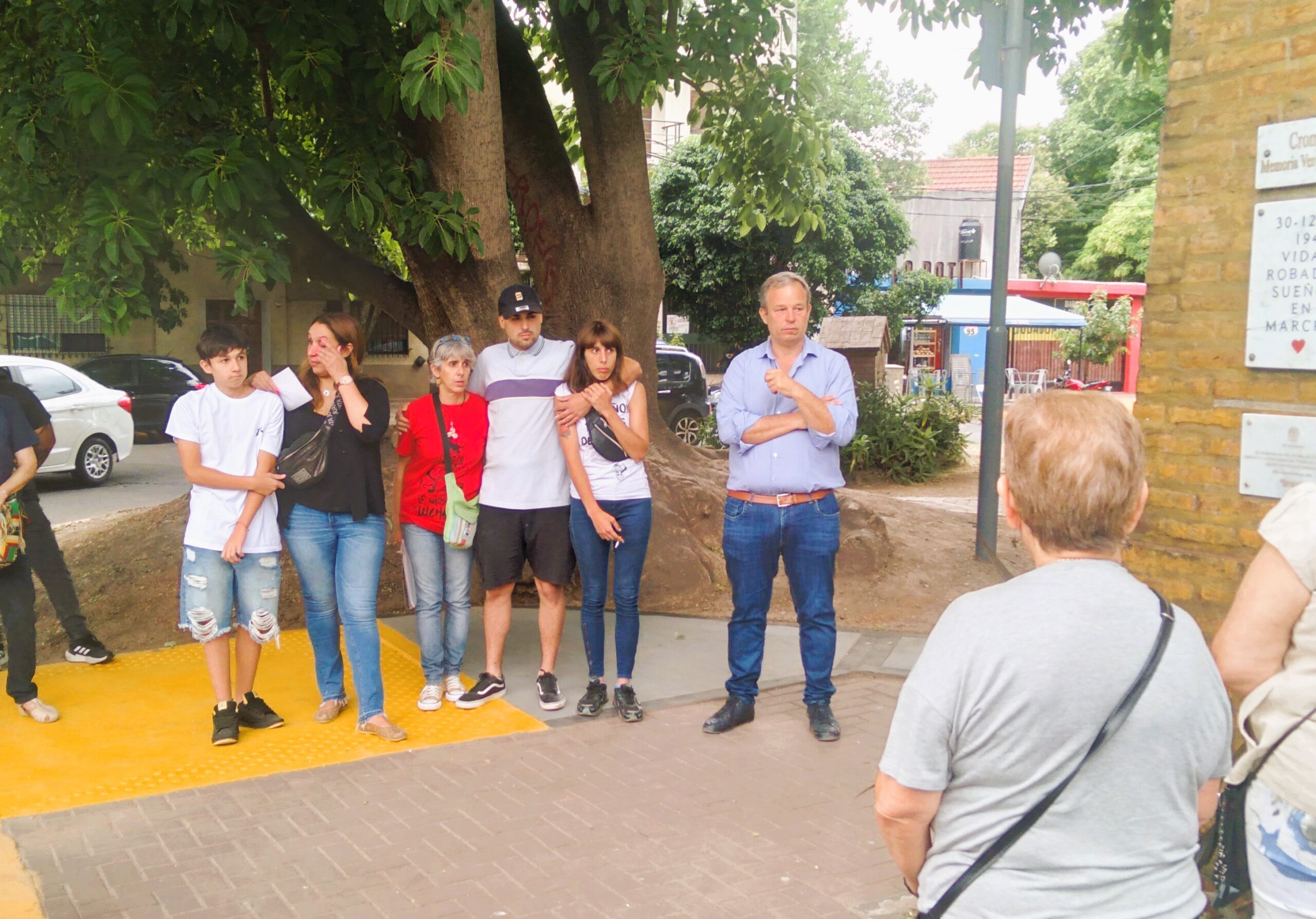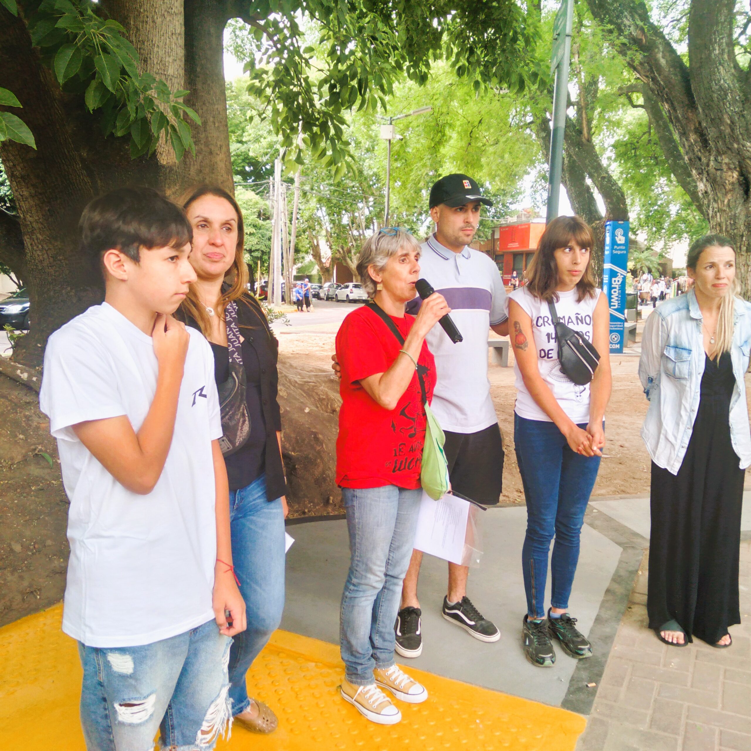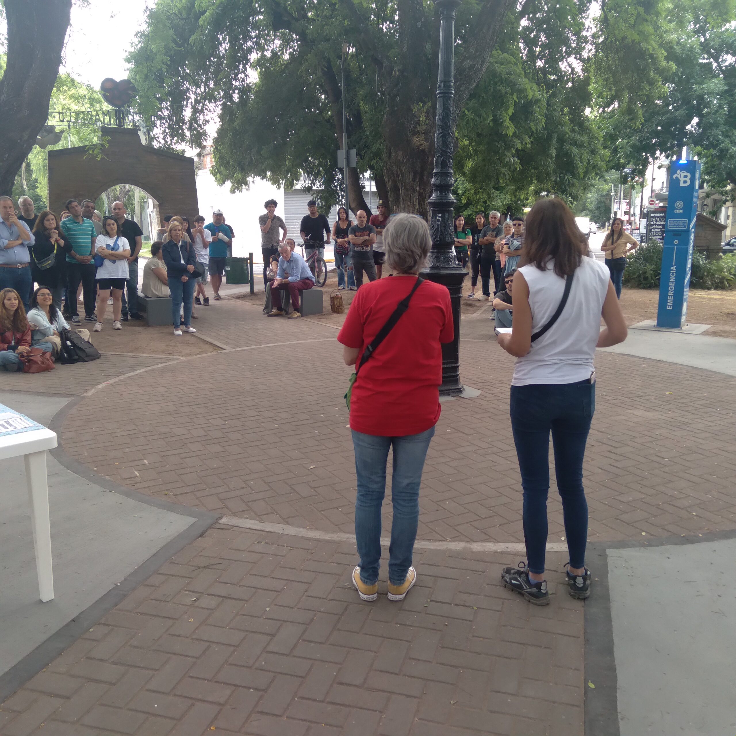 Mientras habla en el micrófono que sostiene con la mano derecha, Matilde percibe en la espalda la mano de su hijo Fabrizio, ubicado a su izquierda. A continuación se encuentra Anahí. La madre luce remera colorada, el muchacho chomba gris y gorra negra, la chica una riñonera de cuerina oscura cruzada sobre su remera blanca. La arboleda frondosa tapa el sol de la tarde del 22 de diciembre en la Plaza Bynnon, localidad de Adrogué, partido bonaerense de Almirante Brown. El bautismo del remanso verde corresponde a un prócer, Santiago Jorge Bynnon, lugarteniente del fundador de la Armada Argentina.