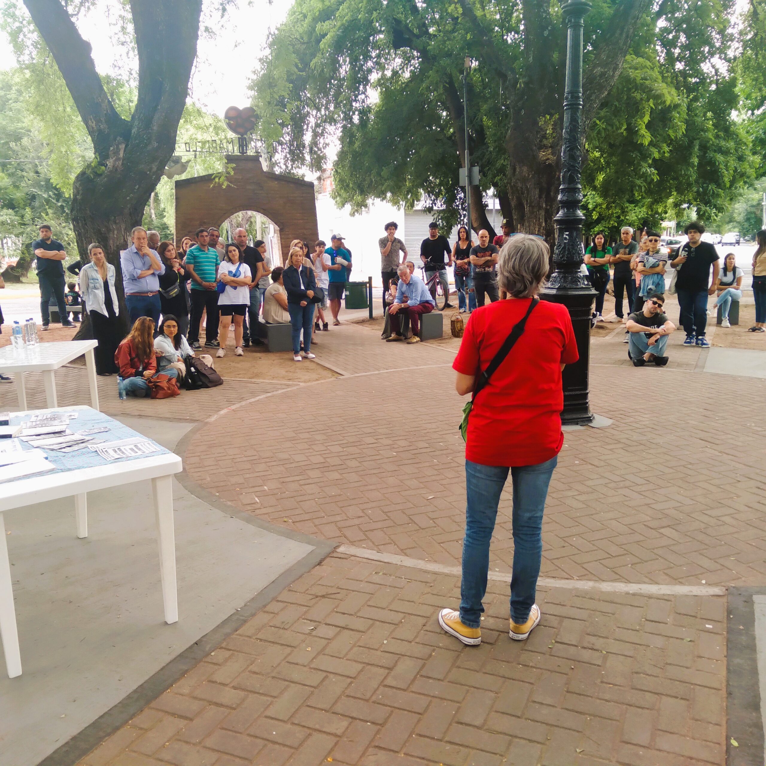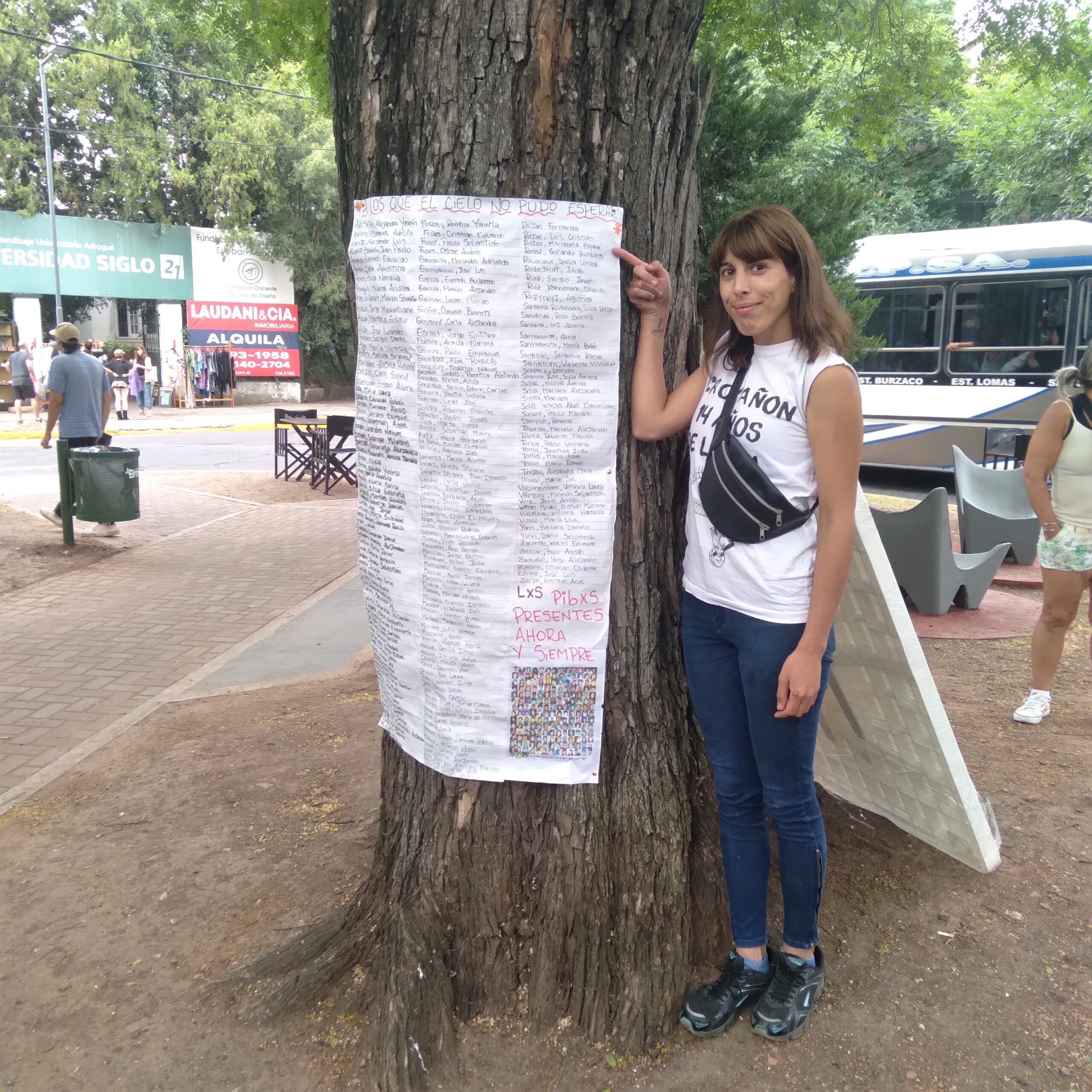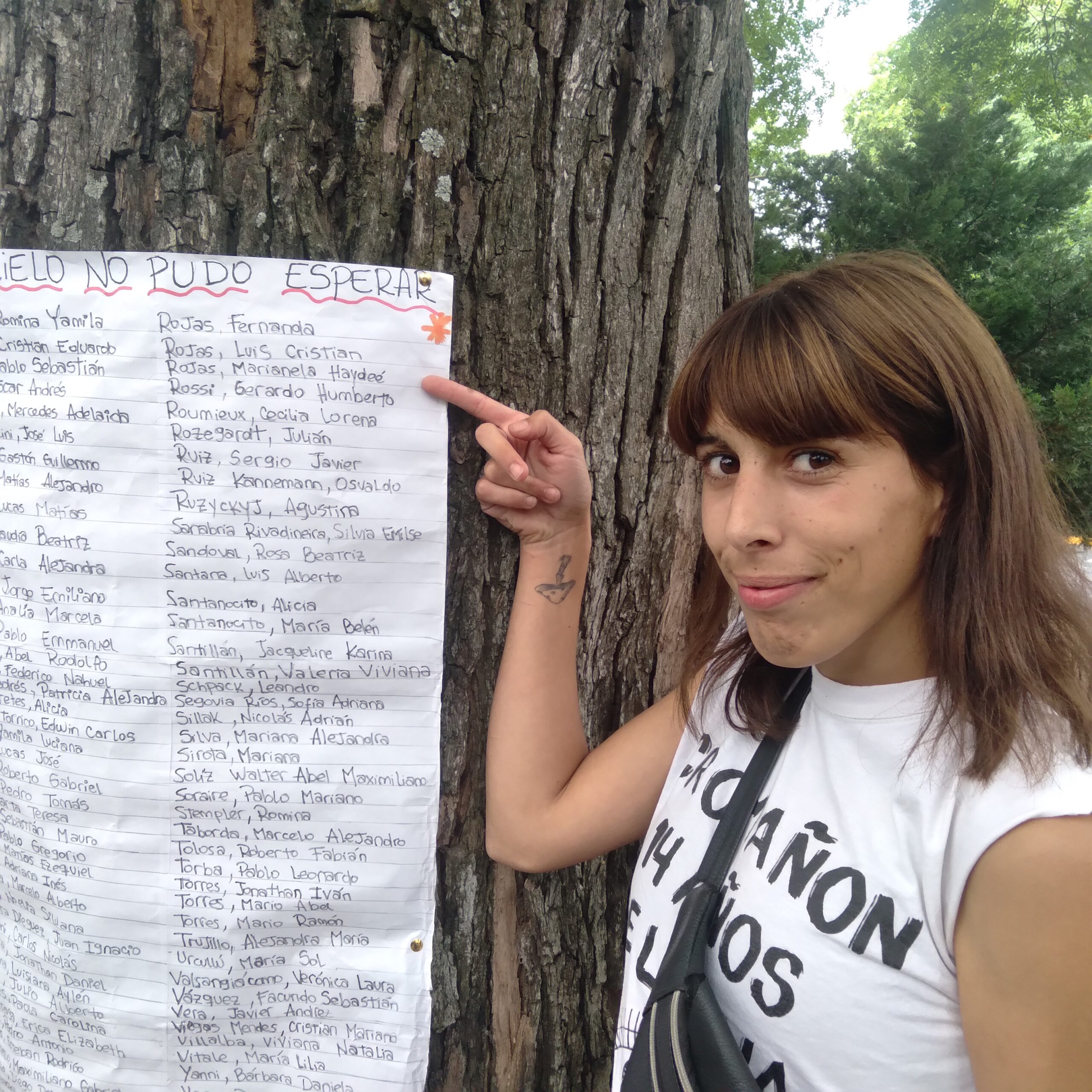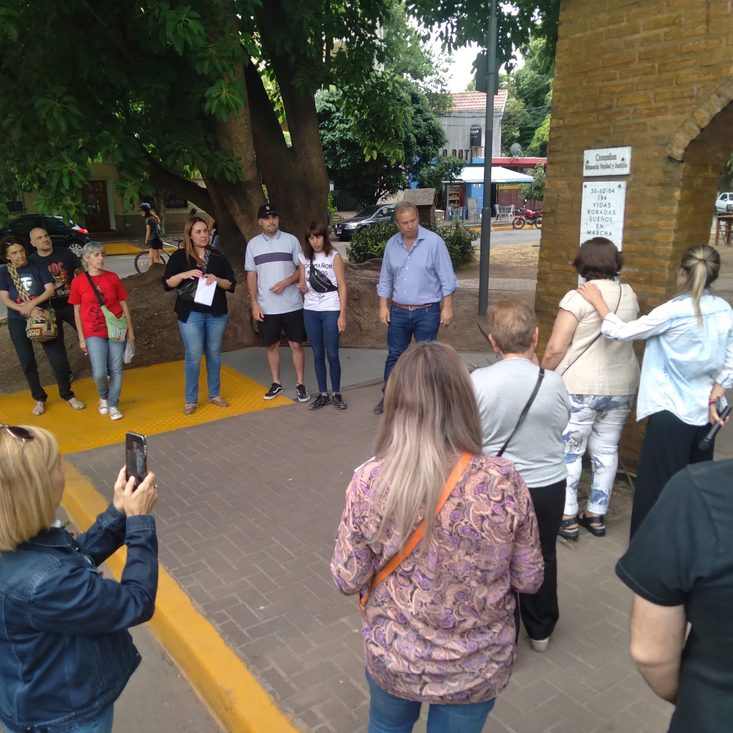 Mientras habla en el micrófono que sostiene con la mano derecha, Matilde percibe en la espalda la mano de su hijo Fabrizio, ubicado a su izquierda. A continuación se encuentra Anahí. La madre luce remera colorada, el muchacho chomba gris y gorra negra, la chica una riñonera de cuerina oscura cruzada sobre su remera blanca. La arboleda frondosa tapa el sol de la tarde del 22 de diciembre en la Plaza Bynnon, localidad de Adrogué, partido bonaerense de Almirante Brown. El bautismo del remanso verde corresponde a un prócer, Santiago Jorge Bynnon, lugarteniente del fundador de la Armada Argentina.