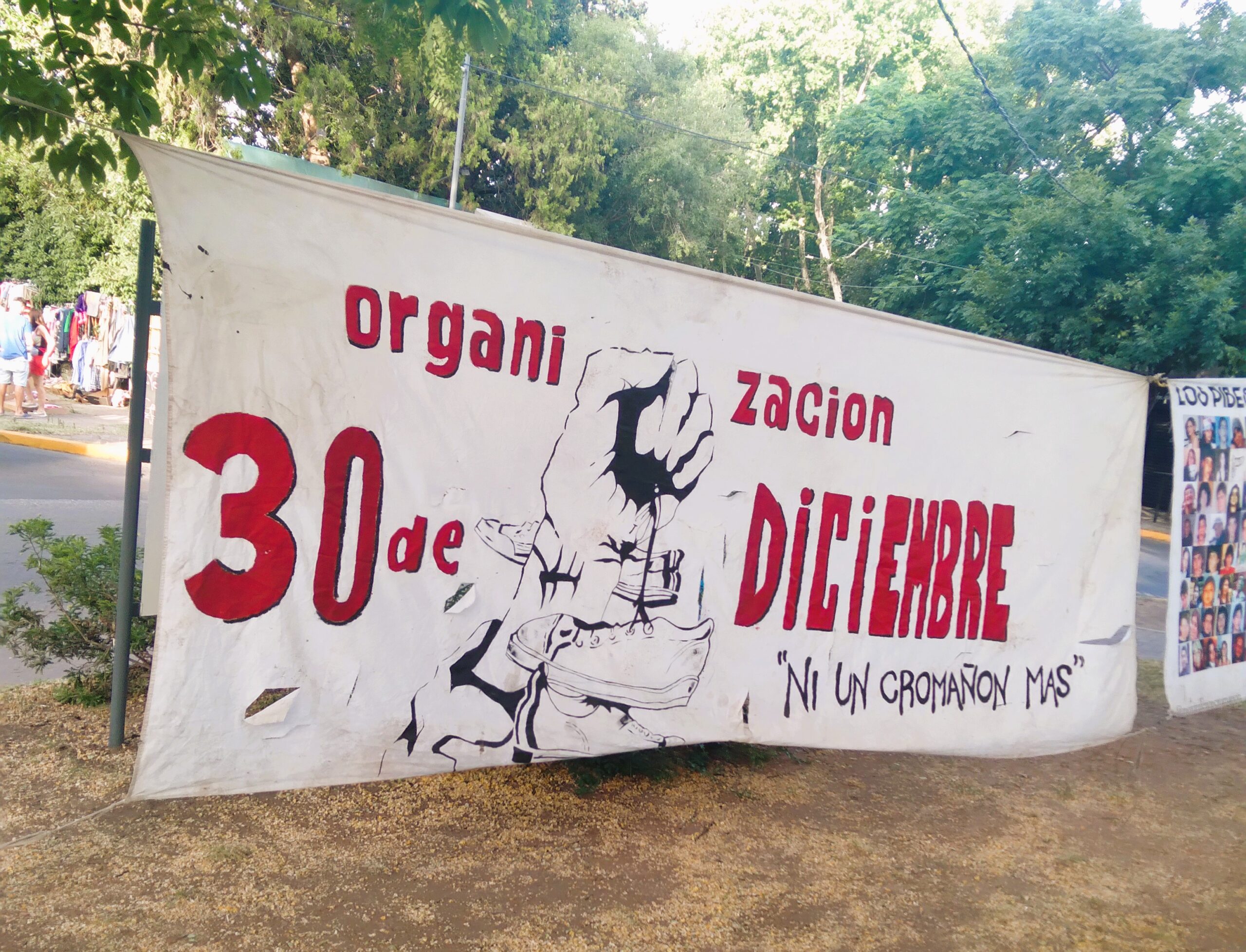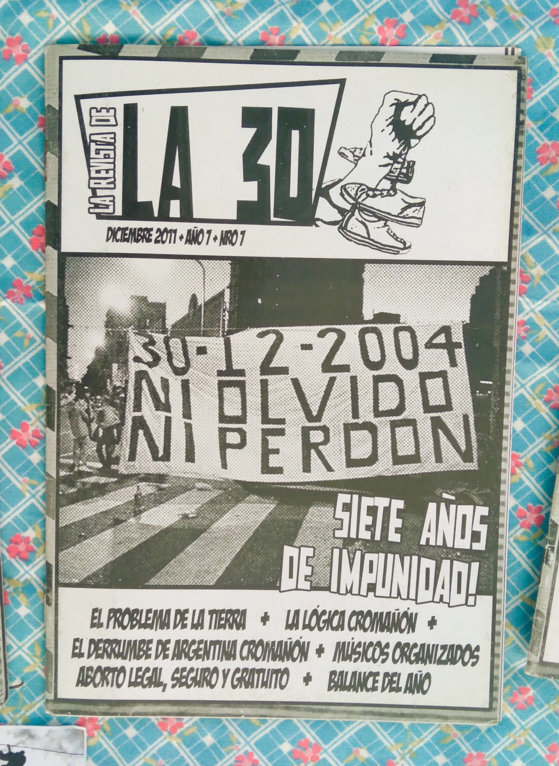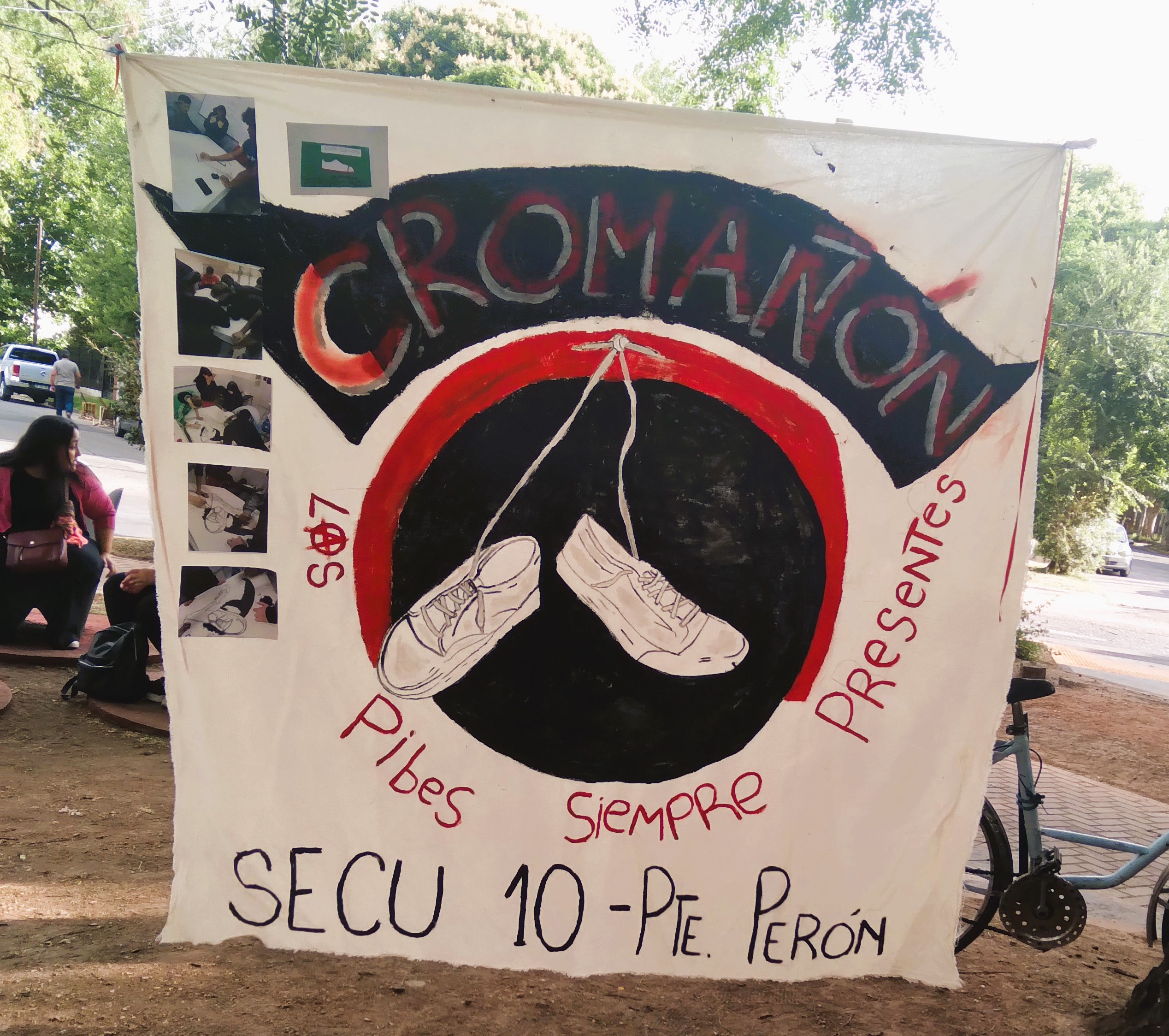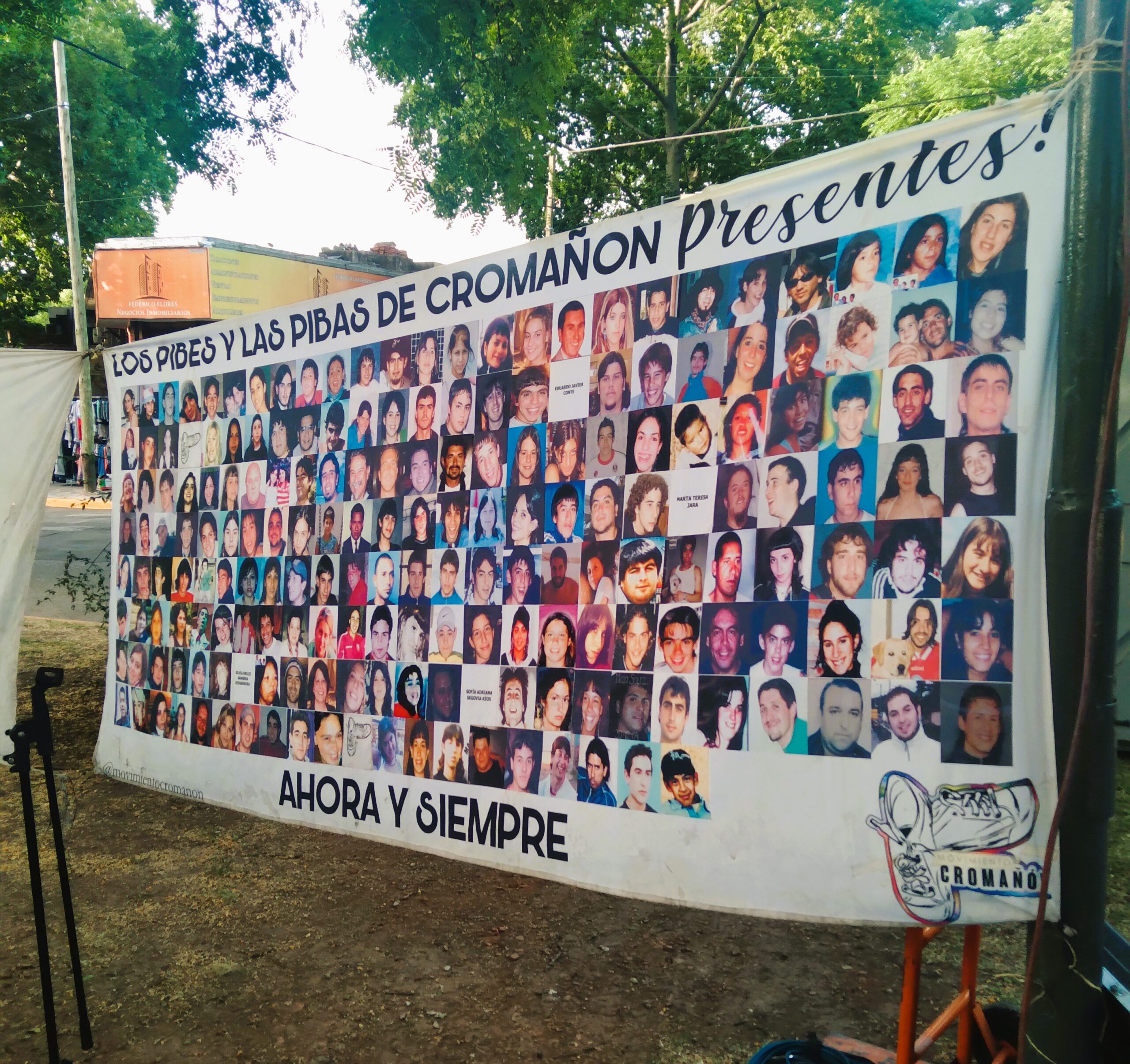 La Plaza Bynnon es una isleta redonda de césped y árboles que funciona como confluencia de tres calles que allende el obstáculo prolongan su recorrido. Por esa causa está rodeada de doce esquinas que generan un efecto urbano pintoresco. El evento cuenta con un equipo de sonido potente y está adornado con pancartas alusivas. «Los pibes y las pibas de Cromañón presentes», afirma un trapo gigante con las caras de los 194 extintos; «ahora y siempre», desafía. «Organización 30 de Diciembre», presenta otra bandera enorme ilustrada con una mano que sostiene un par de zapatillas; «ni un Cromañón más».