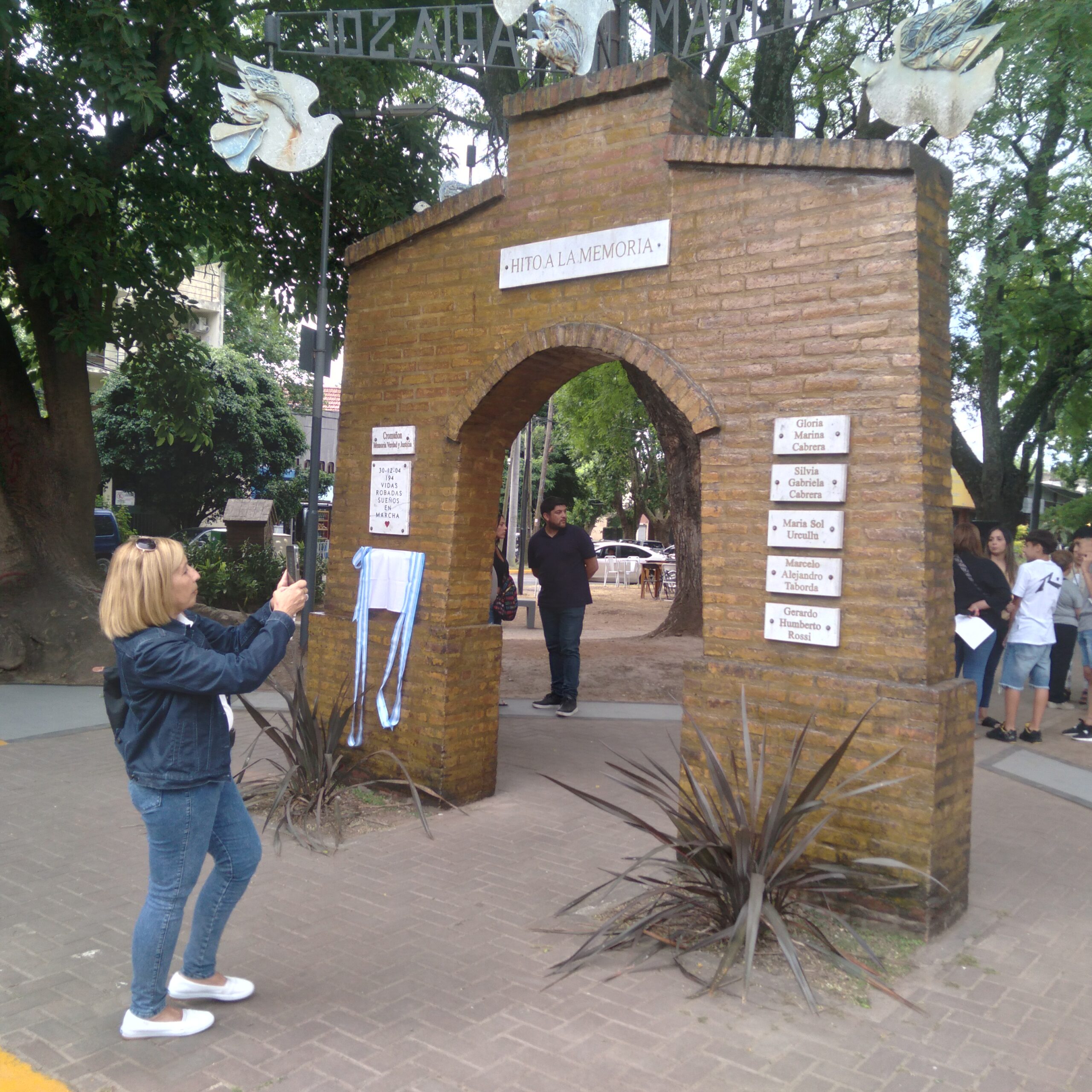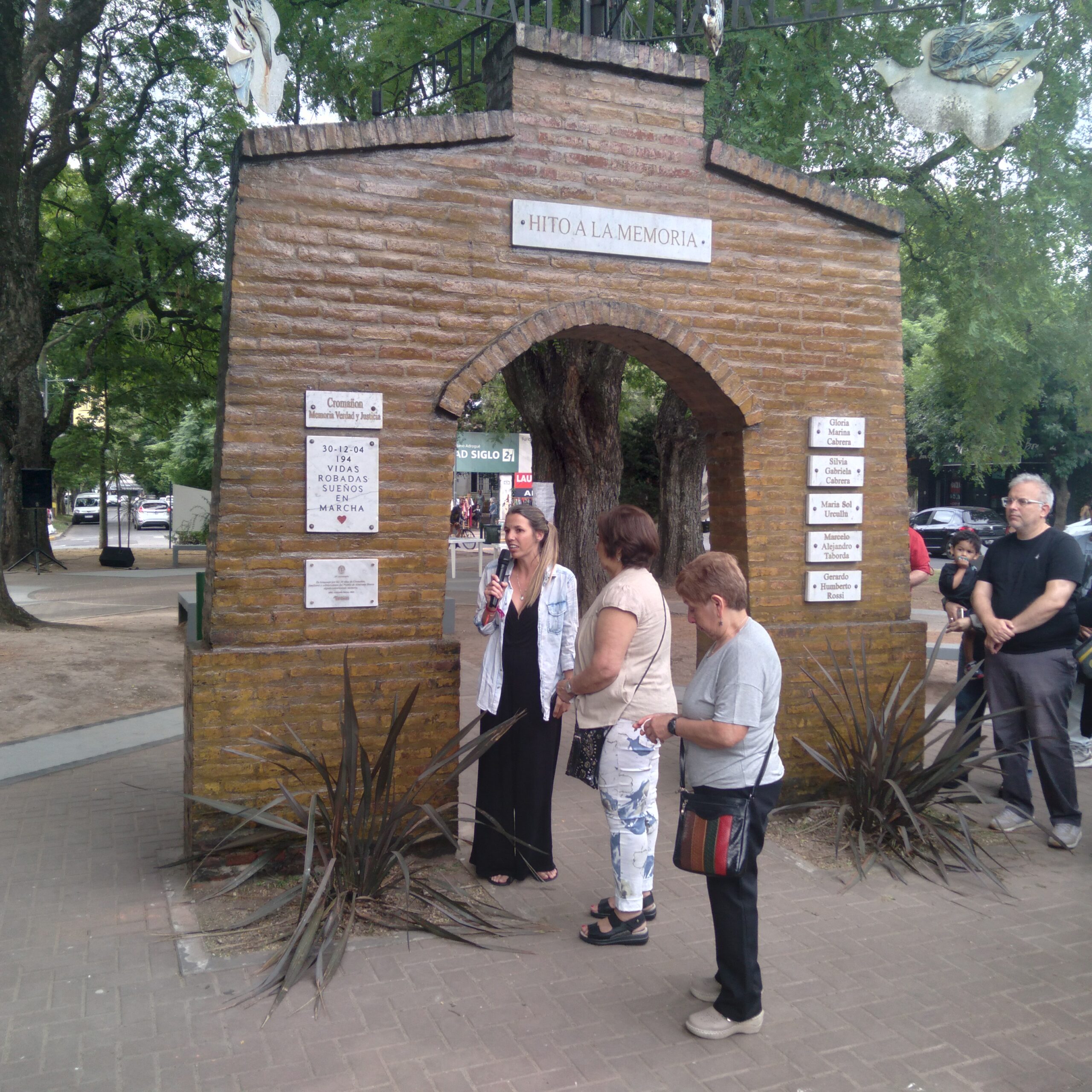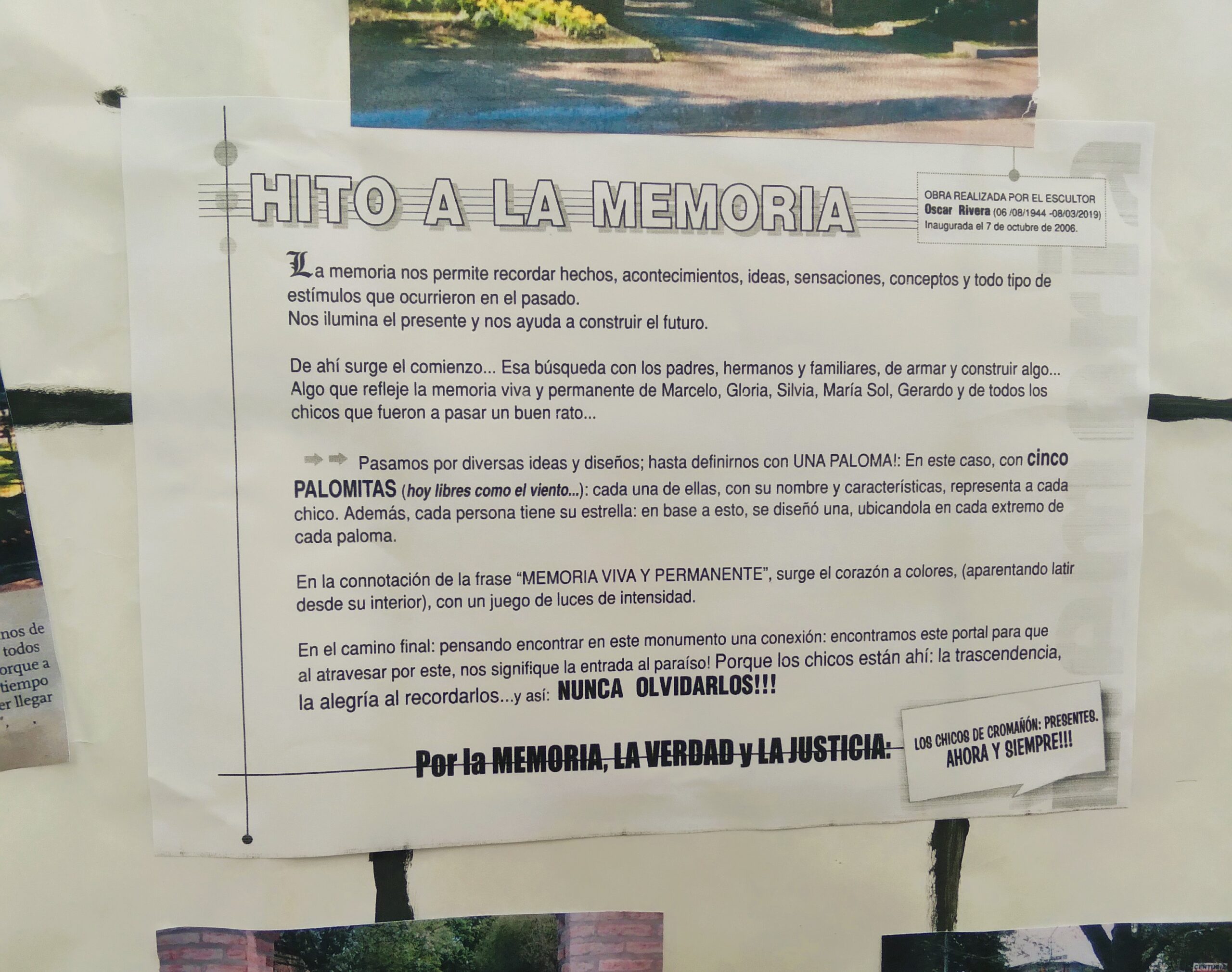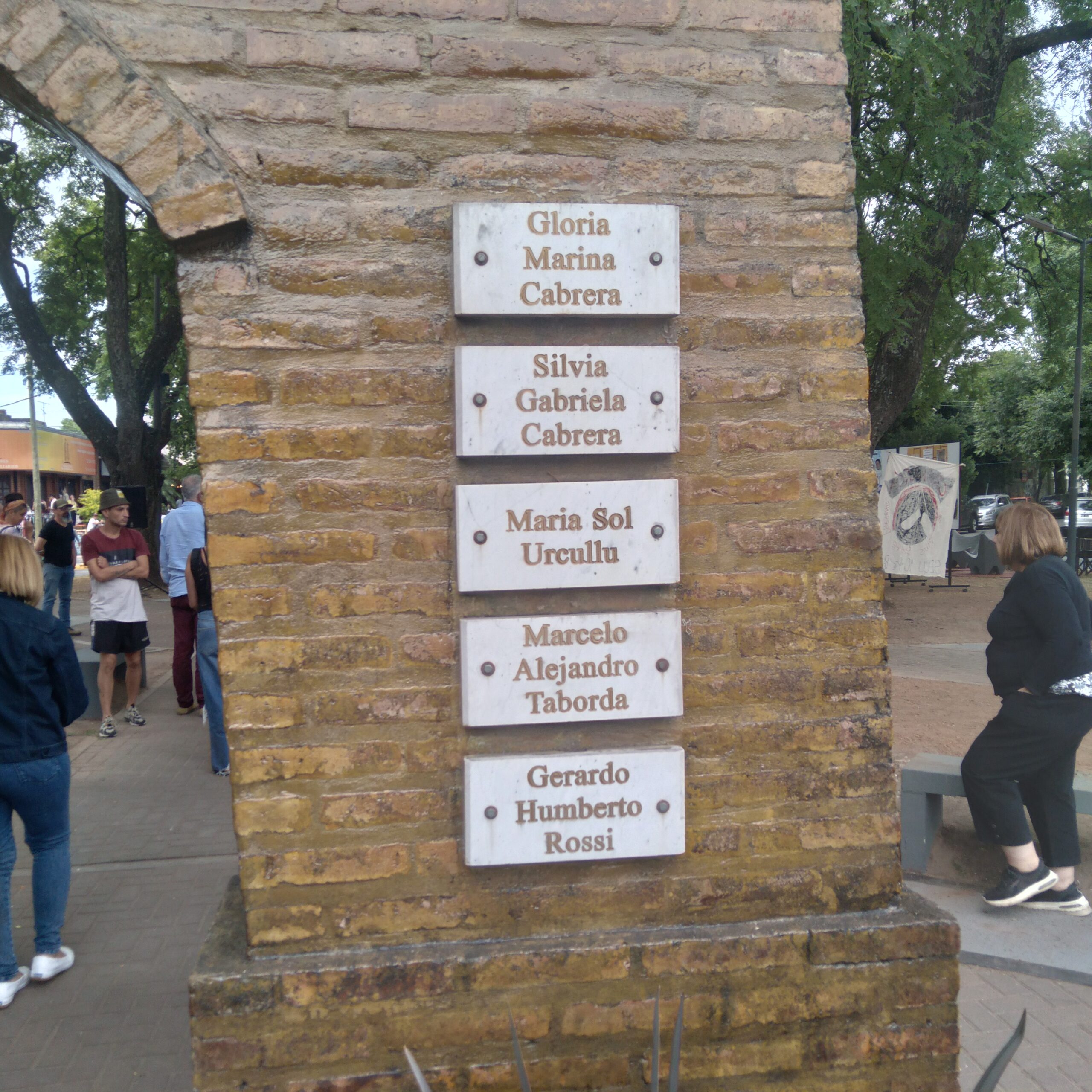 «De izquierda a derecha: Tomás, hijo de Carolina Taborda», describirá la voz del testimonio la imagen de portada de esta crónica; «Carolina Taborda (sobreviviente y hermana de Marcelo Taborda); yo, Fabrizio, Anahí; y Bárbara Miñán, secretaria de Derechos Humanos de la Municipalidad». Delante de ellos, fuera de la toma fotográfica, se eleva el Hito de la Memoria, un arco de ladrillos vistos de cuatro metros de alto en honor de los lugareños fallecidos en el incendio: Gloria Marina Cabrera, Silvia Gabriela Cabrera (hermanas), María Sol Urcullú, Marcelo Alejandro Taborda y Gerardo Humberto Rossi.