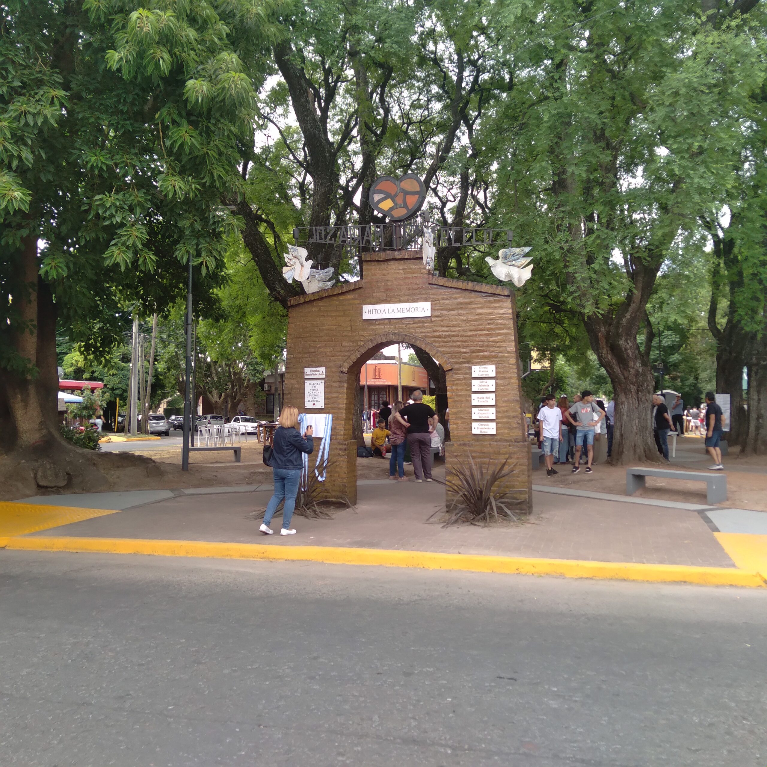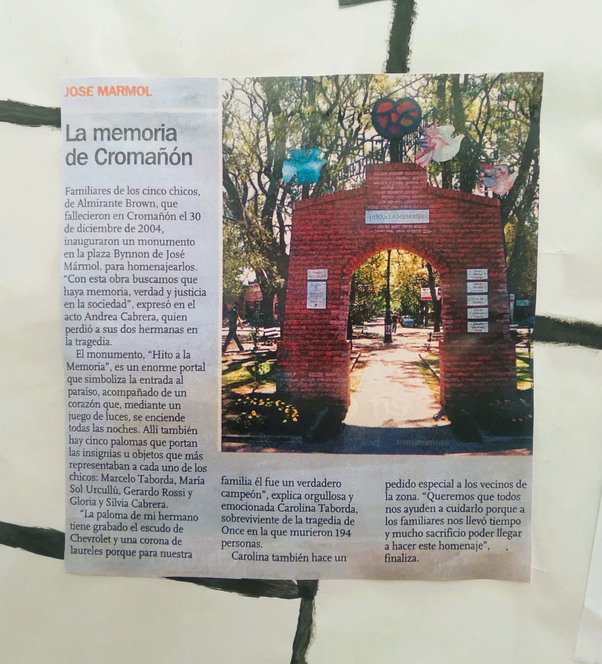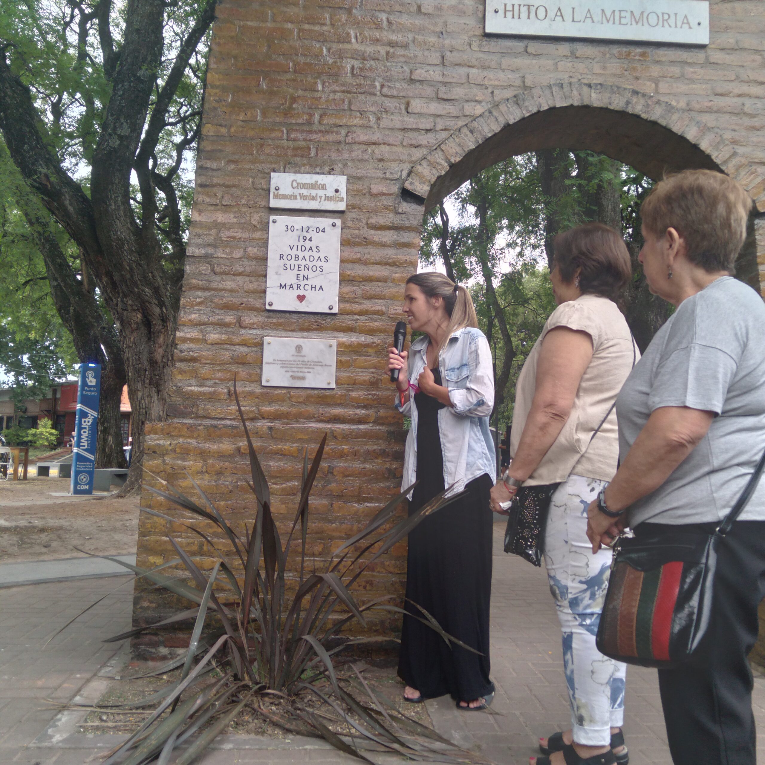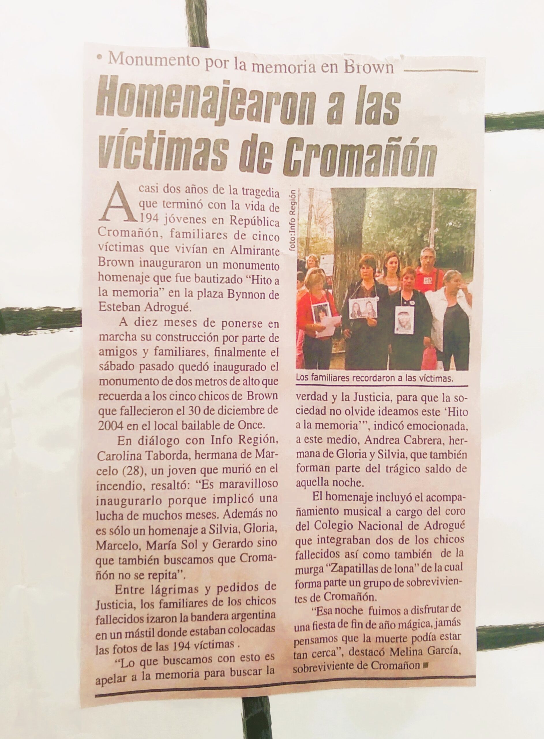 «De izquierda a derecha: Tomás, hijo de Carolina Taborda», describirá la voz del testimonio la imagen de portada de esta crónica; «Carolina Taborda (sobreviviente y hermana de Marcelo Taborda); yo, Fabrizio, Anahí; y Bárbara Miñán, secretaria de Derechos Humanos de la Municipalidad». Delante de ellos, fuera de la toma fotográfica, se eleva el Hito de la Memoria, un arco de ladrillos vistos de cuatro metros de alto en honor de los lugareños fallecidos en el incendio: Gloria Marina Cabrera, Silvia Gabriela Cabrera (hermanas), María Sol Urcullú, Marcelo Alejandro Taborda y Gerardo Humberto Rossi.
