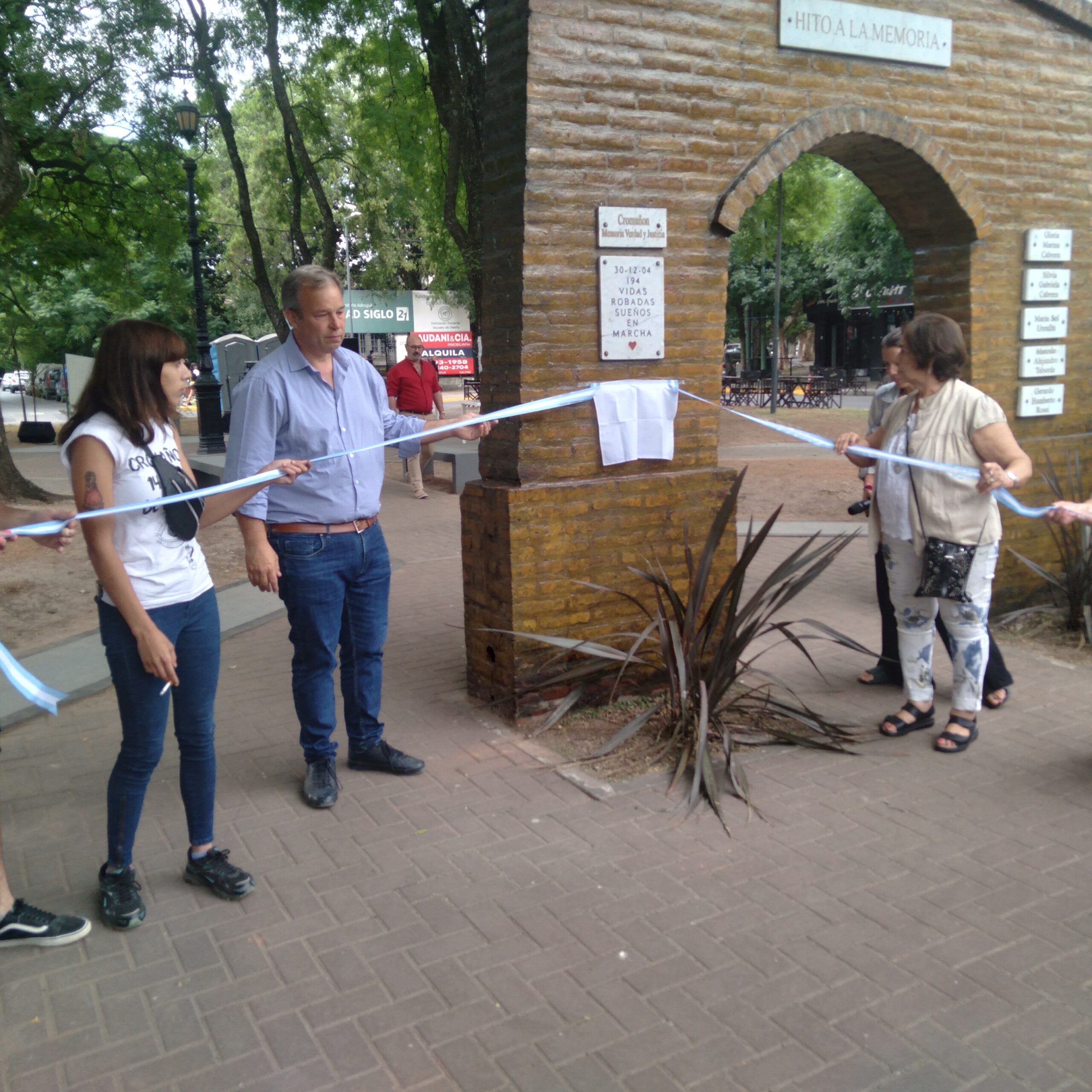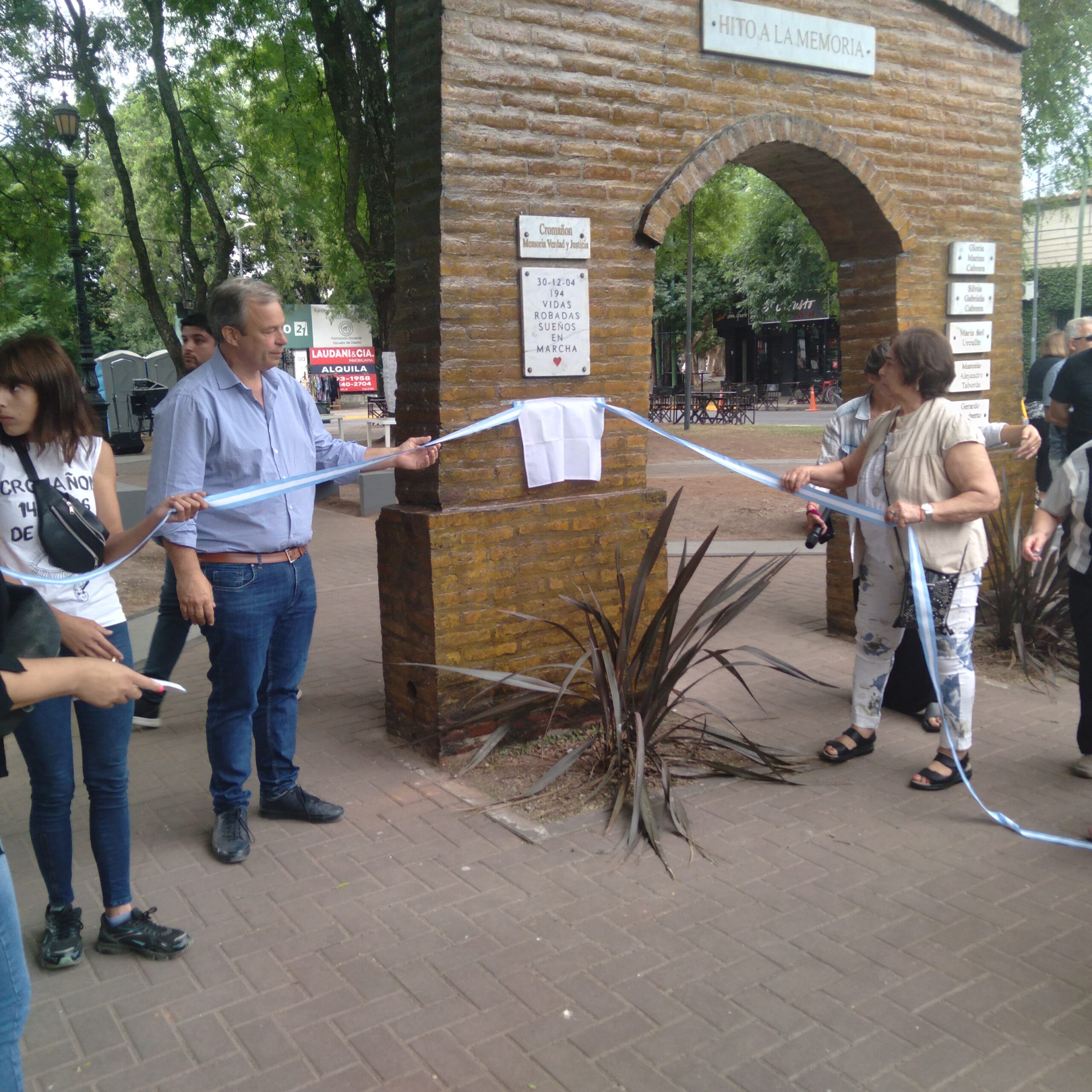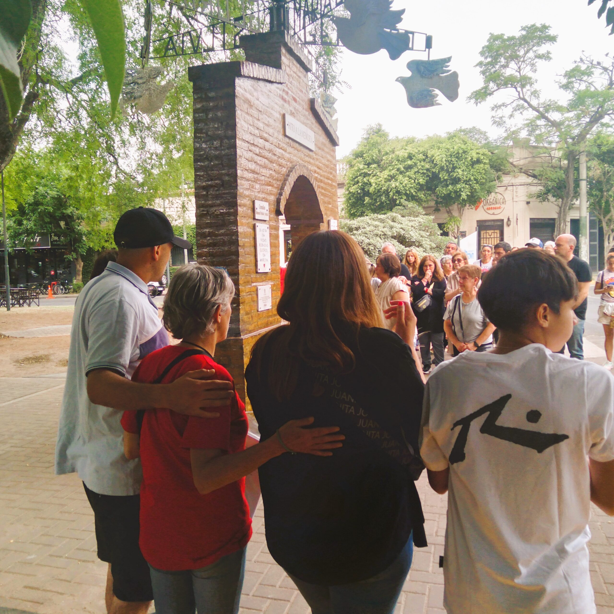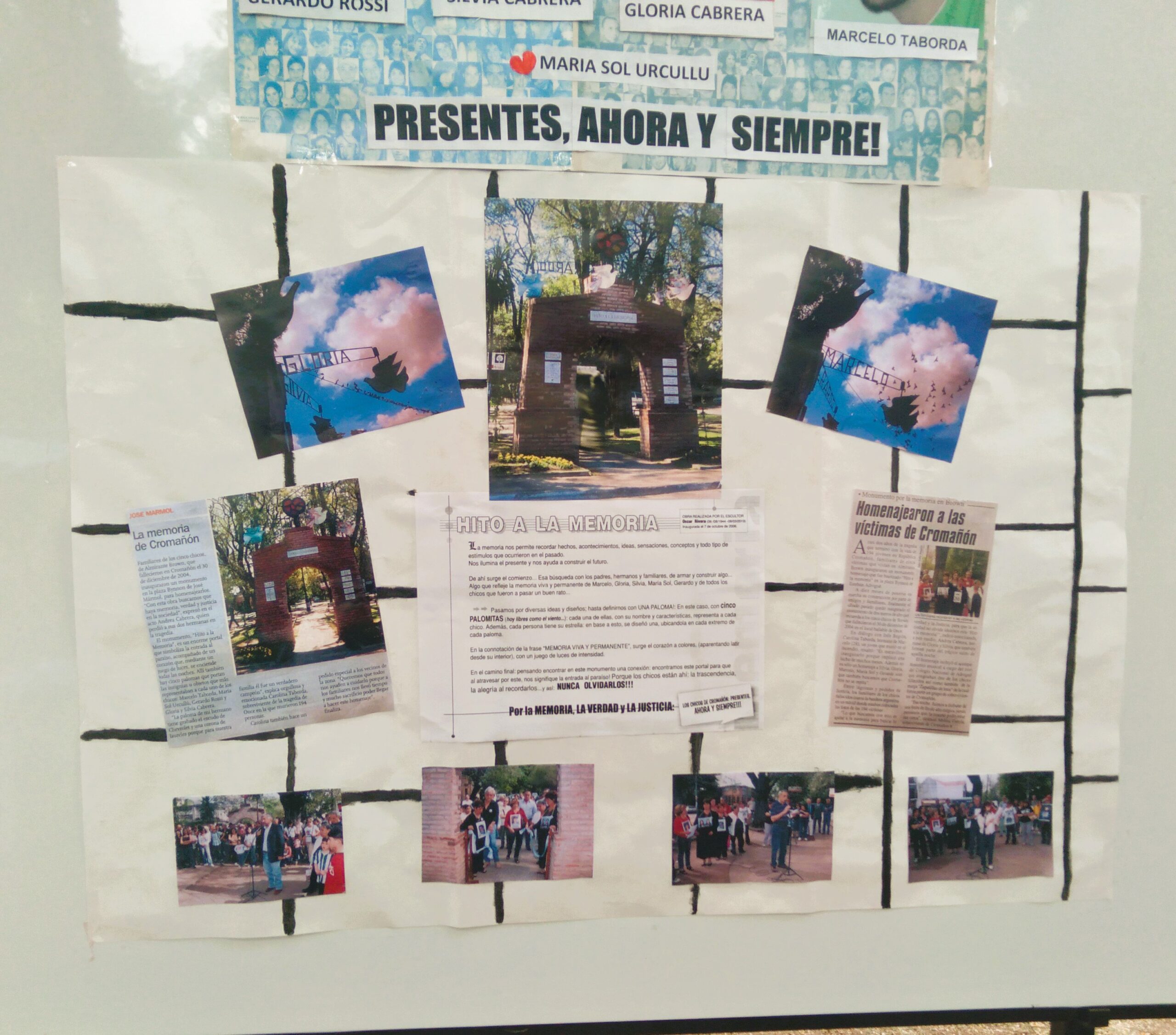 «De izquierda a derecha: Tomás, hijo de Carolina Taborda», describirá la voz del testimonio la imagen de portada de esta crónica; «Carolina Taborda (sobreviviente y hermana de Marcelo Taborda); yo, Fabrizio, Anahí; y Bárbara Miñán, secretaria de Derechos Humanos de la Municipalidad». Delante de ellos, fuera de la toma fotográfica, se eleva el Hito de la Memoria, un arco de ladrillos vistos de cuatro metros de alto en honor de los lugareños fallecidos en el incendio: Gloria Marina Cabrera, Silvia Gabriela Cabrera (hermanas), María Sol Urcullú, Marcelo Alejandro Taborda y Gerardo Humberto Rossi.