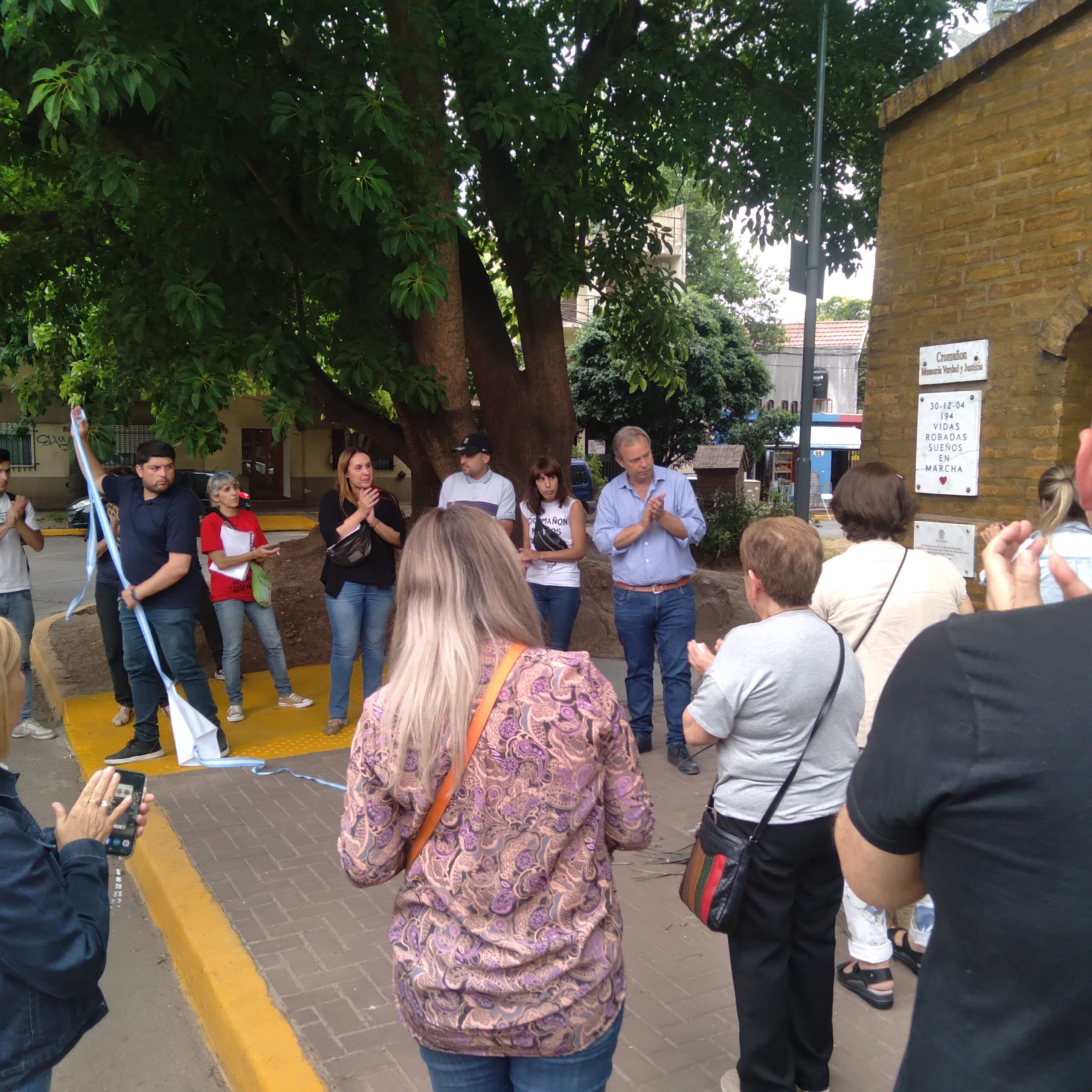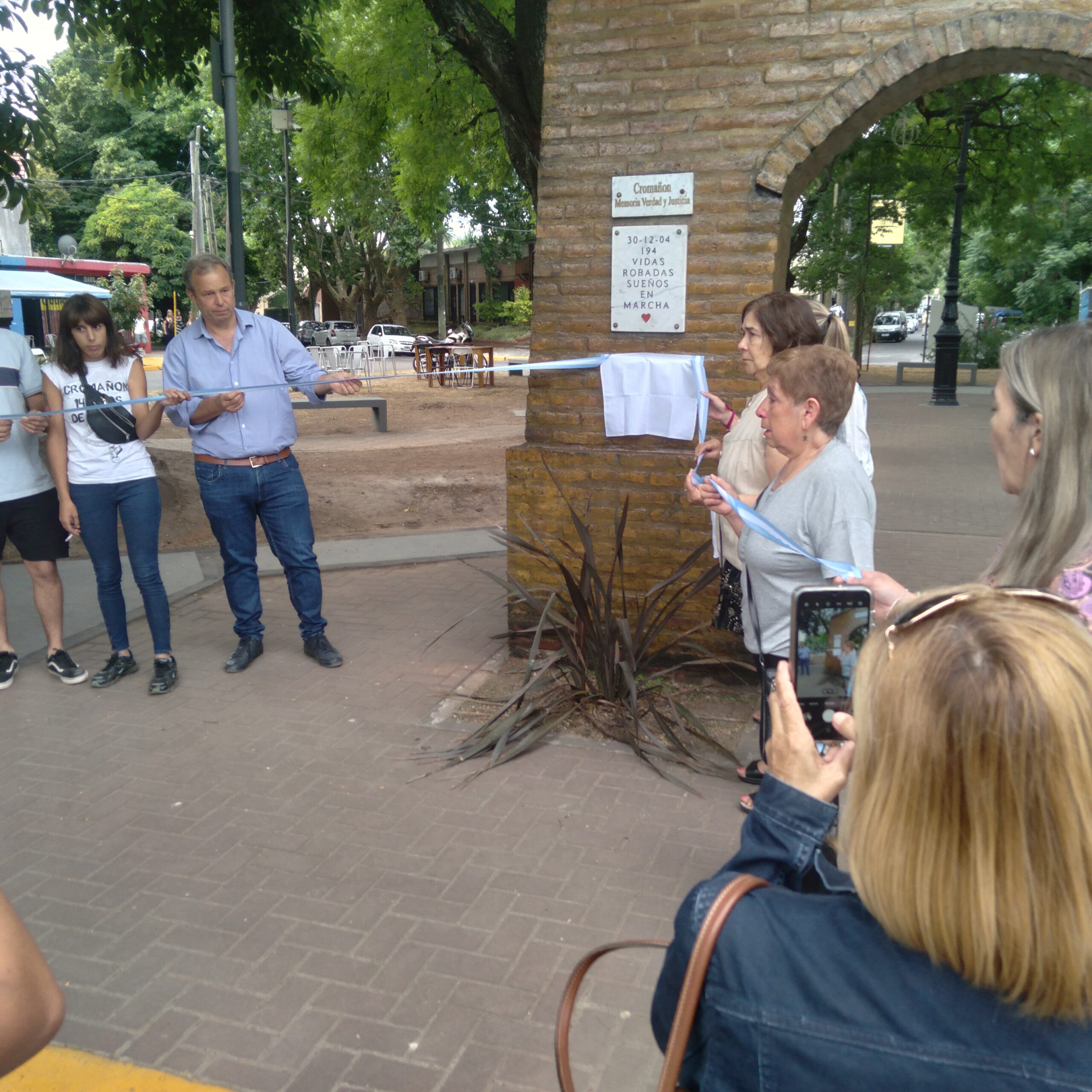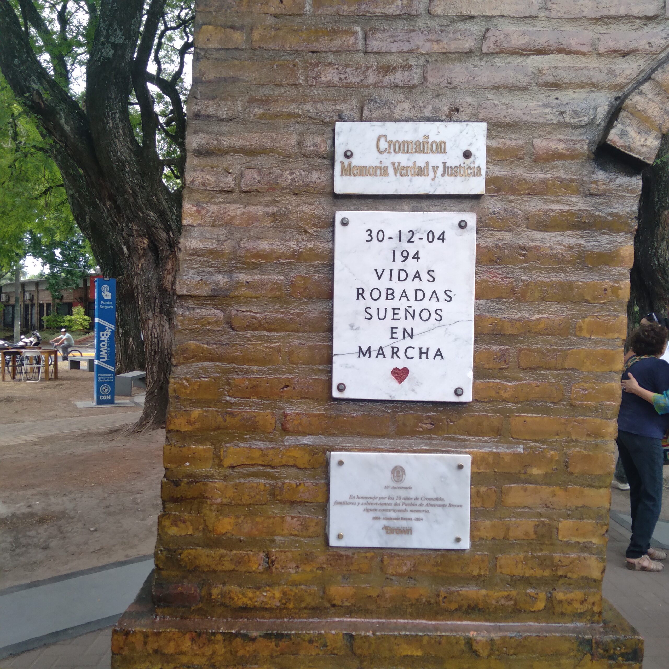Mariano Cascallares, el intendente, es la presencia política descollante en la Plaza Bynnon. Acaba de tirar de una cinta para descubrir una placa de mármol blanco sobre los ladrillos vistos. «En homenaje por los 20 años de Cromañón, familiares y sobrevivientes del partido de Almirante Brown siguen haciendo memoria. 2004 – 30 de diciembre – 2024», dice la piedra. «Hito a la Memoria», reza una leyenda esculpida sobre otra lámina de roca alba que encabeza el portal. La ceremonia es contemplada por decenas de asistentes entre los que se cuentan víctimas, familiares, amigos, ciudadanos y funcionarios.