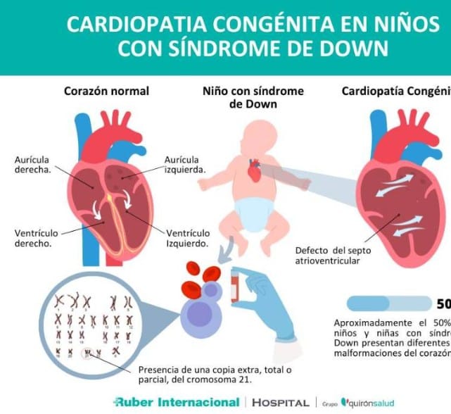 Las cardiopatías congénitas en niños con síndrome de Down producen hipertensión pulmonar, que es causa de deficiencia en el crecimiento y el desarrollo. Las cirugías dentro de lo posible se difieren, para que el niño logre un grado mínimo de fortaleza física. De lo contrario, podría ser incapaz de soportarlas. Salvo que se trate de una urgencia por insuficiencia cardíaca congestiva: el corazón carece de potencia suficiente para el bombeo y se inundan los pulmones de líquidos. Algo que se detecta mediante electrocardiograma y ecocardiograma.