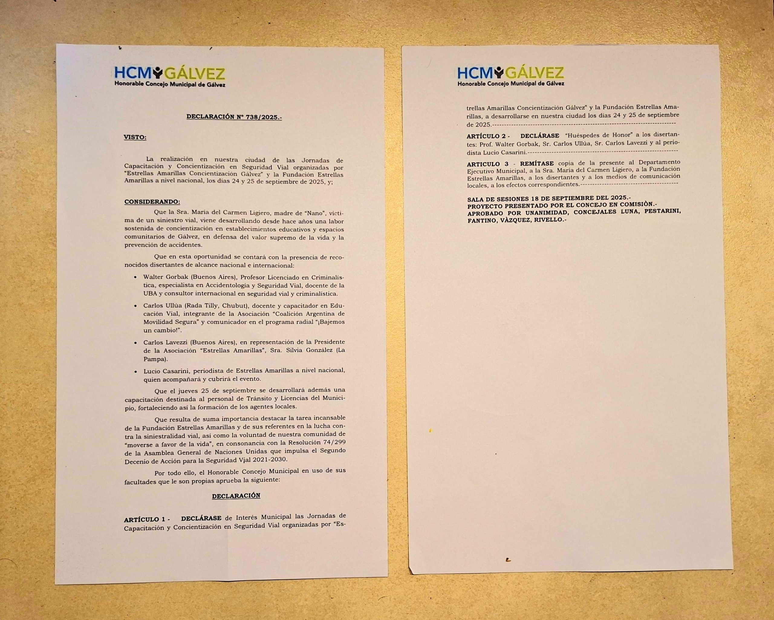 Decidida a convertir el dolor en acción, María del Carmen Ligiero, acompañada por sus hijos Pamela y Diego Ruiz, impulsa el proyecto Estrellas Amarillas – Concientización – Gálvez. La actividad mencionada en esta nota contó con el auspicio de la Comuna y la presencia de dos expertos de relevancia nacional: Walter Jorge Gorbak, perito criminalístico de la Capital Federal, y Carlos Ullúa Schiriak, experto en concientización vial de Rada Tilly, provincia de Chubut. El hijo de la protagonista de la historia tenía 20 años cuando el 29 de noviembre de 2015 perdió la vida junto a una amiga circulando en moto sin casco.