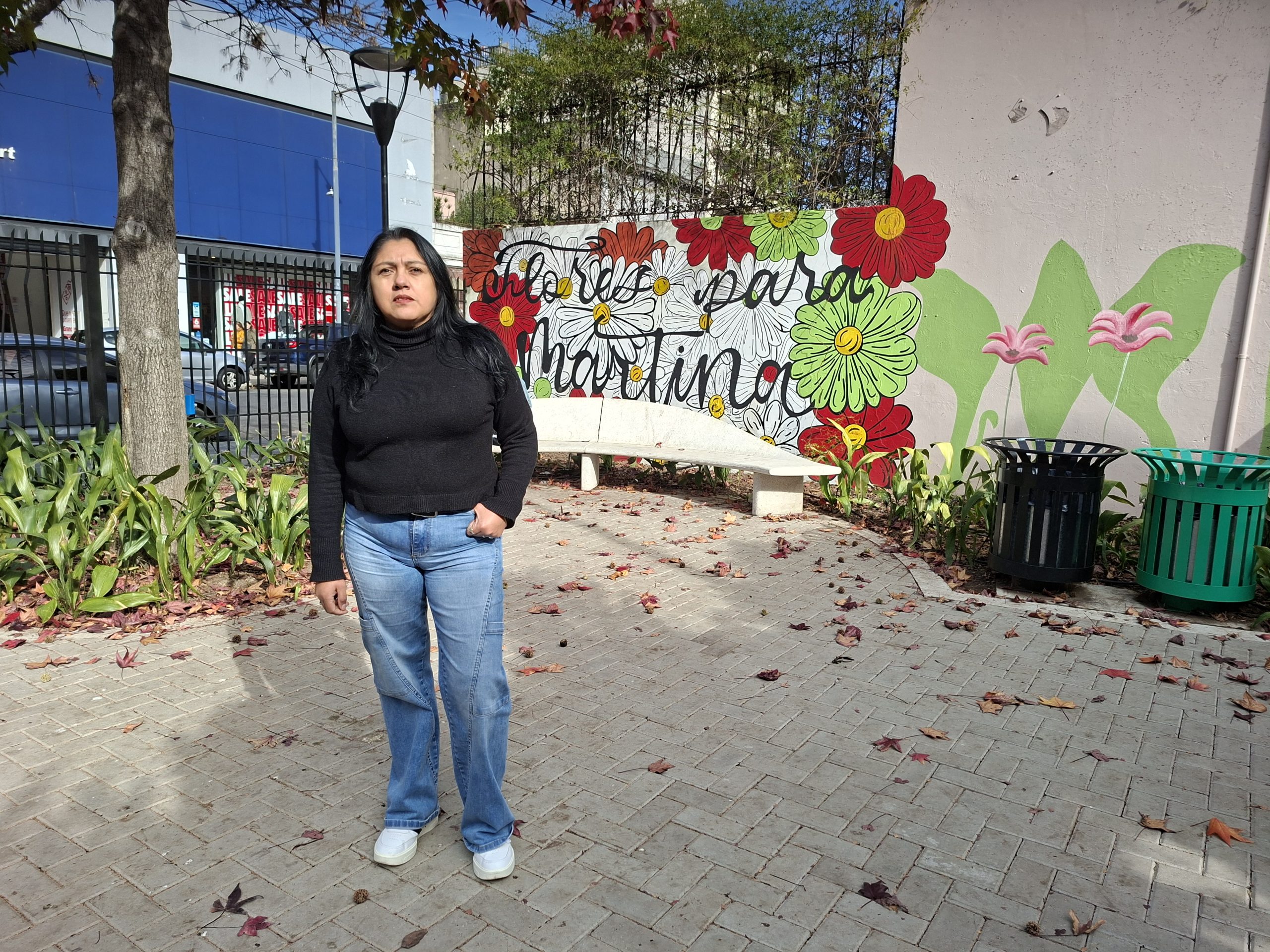 «Victoria propuso si me dan todas las paredes, yo me hago cargo y pinto; sin saber si nos iban a dar el ok; la cuestión es que nos dijeron que sí: totalmente, la plaza es suya; nos entregaron la llave para poder entrar con las cosas; Victoria me dijo yo no pinto muerte, pinto vida, dejame ver qué se me ocurre y, si vos lo aceptás, yo arranco; al otro día me llama y me dice tu hija no me dejó dormir, ya sé lo que ella quiere y se va a llamar Flores para Martina; si vos estás dispuesta a aceptar esta idea, yo comienzo la obra; me anticipó que quería ver a Martina trascender».