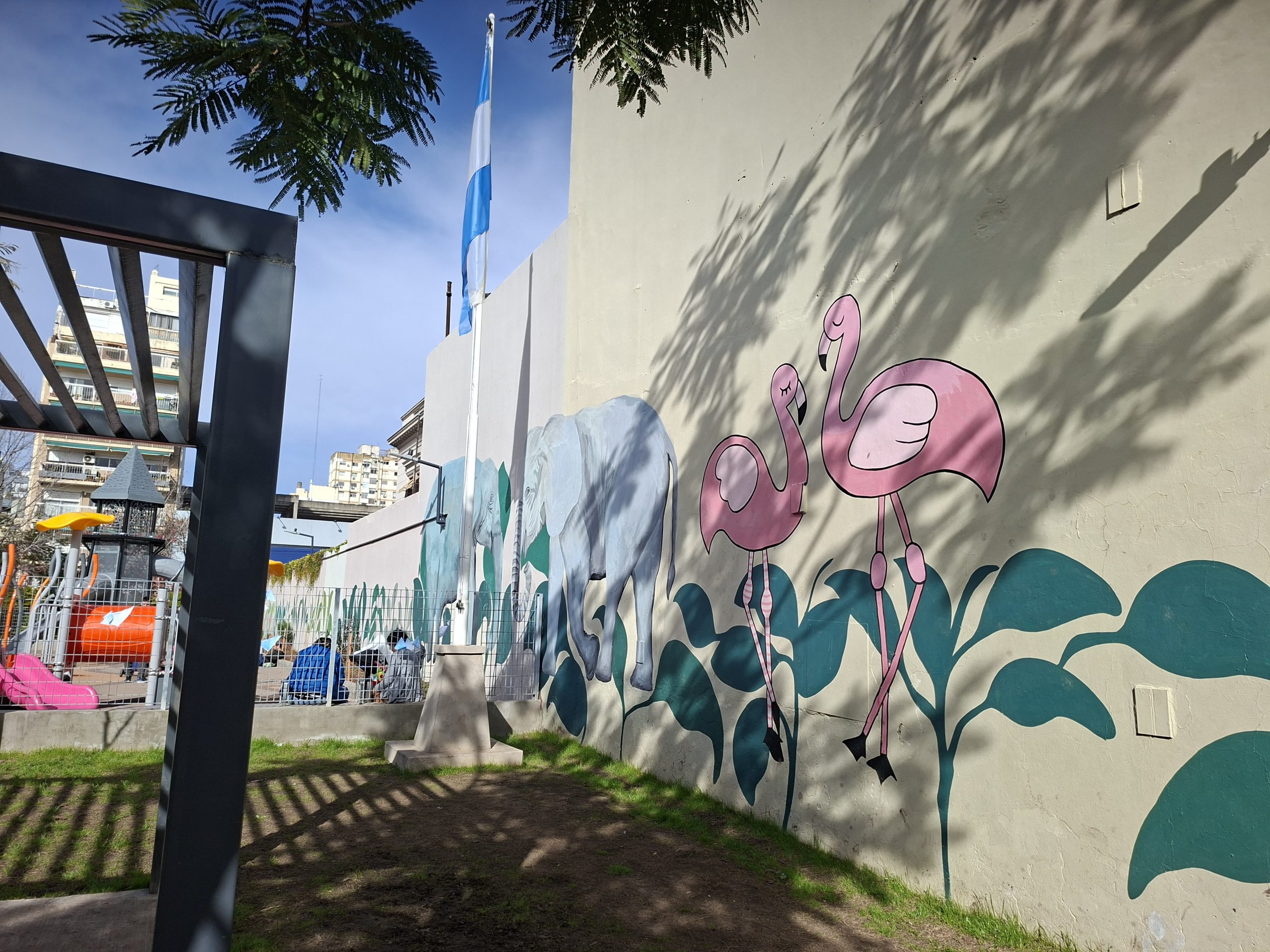 Una pareja de elefantes y otra de flamencos en un muro del Patio John Malcolm.
