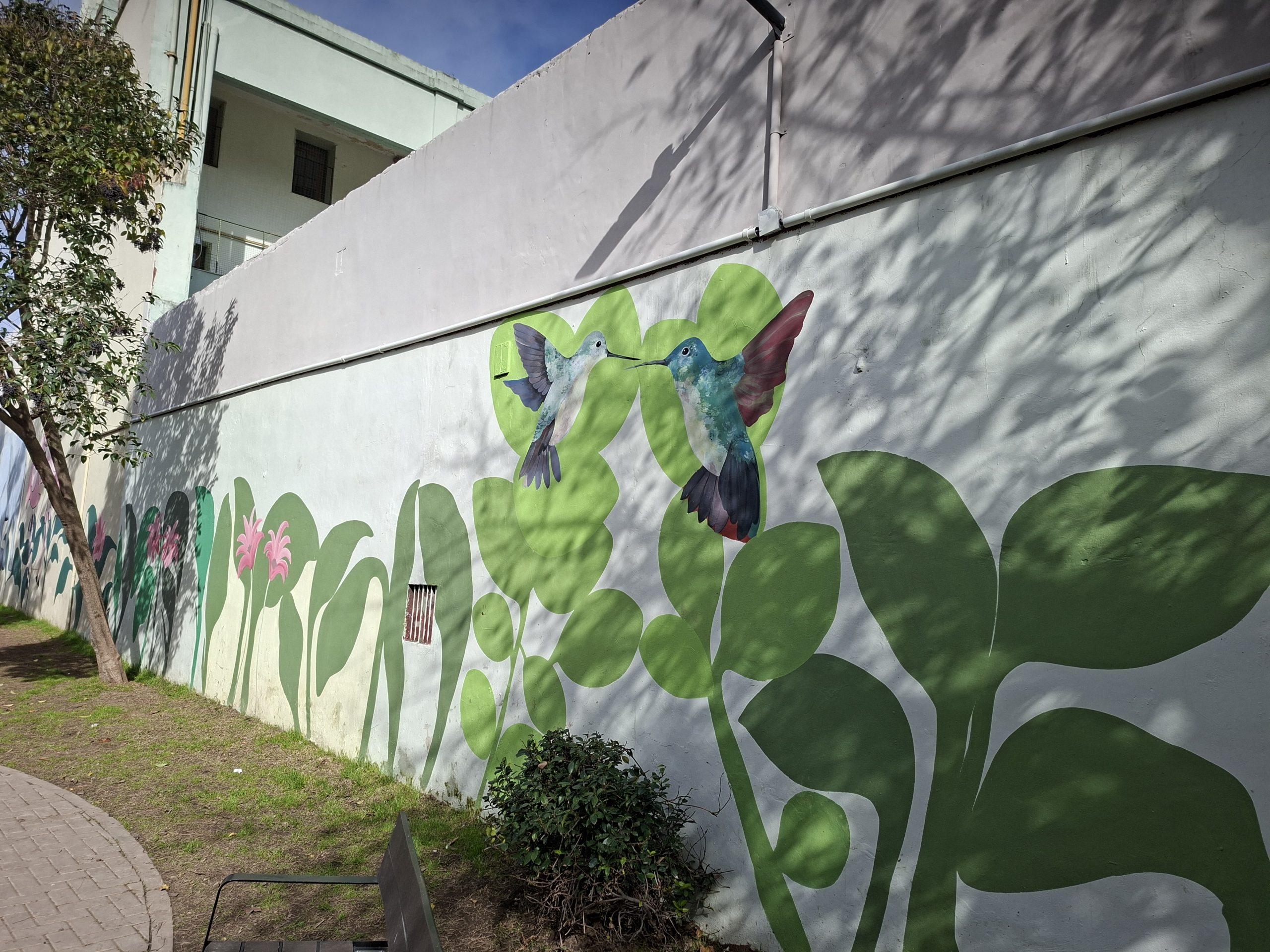 Una pareja de colibrís en una pared del Patio John Malcolm.
