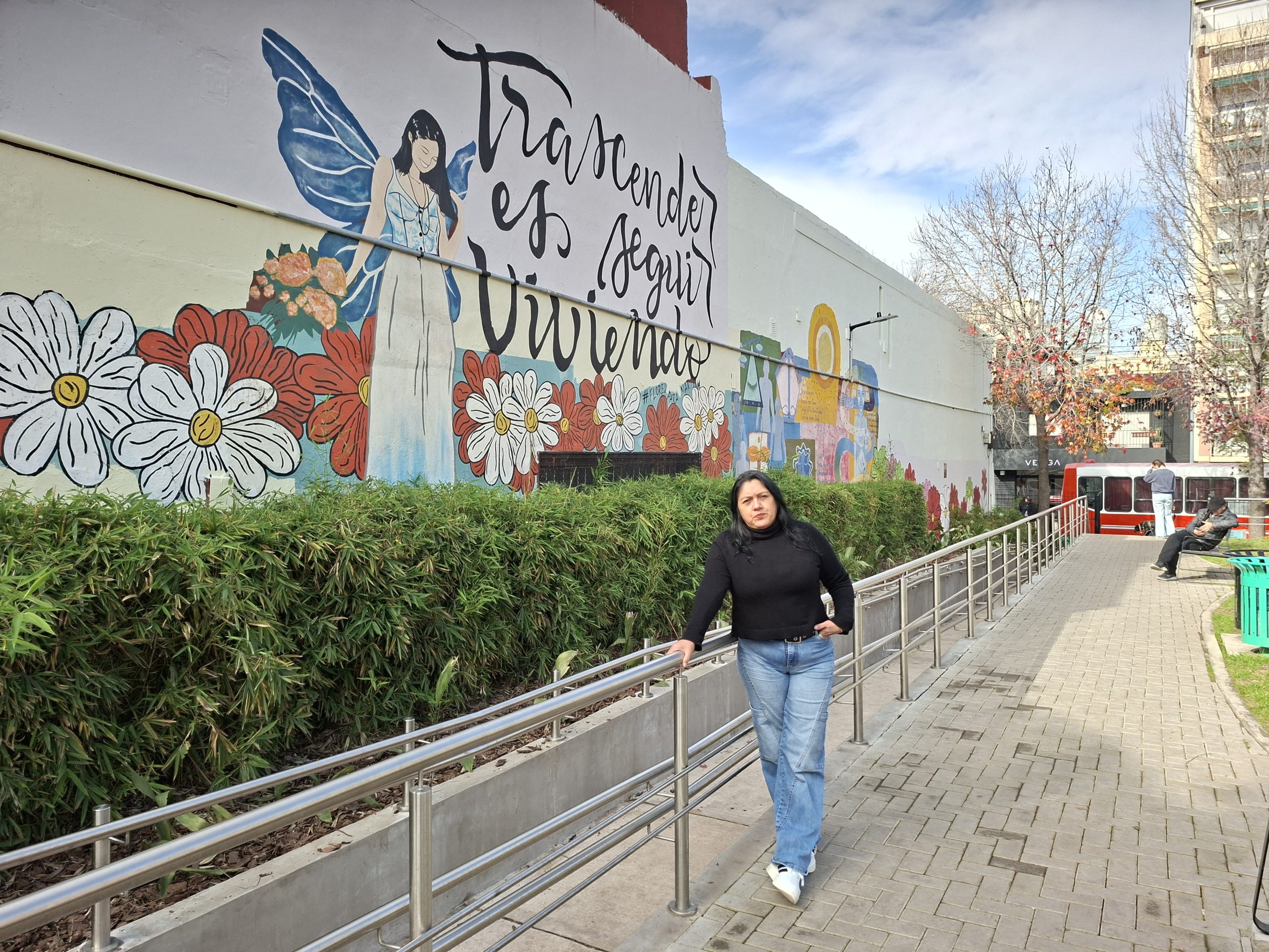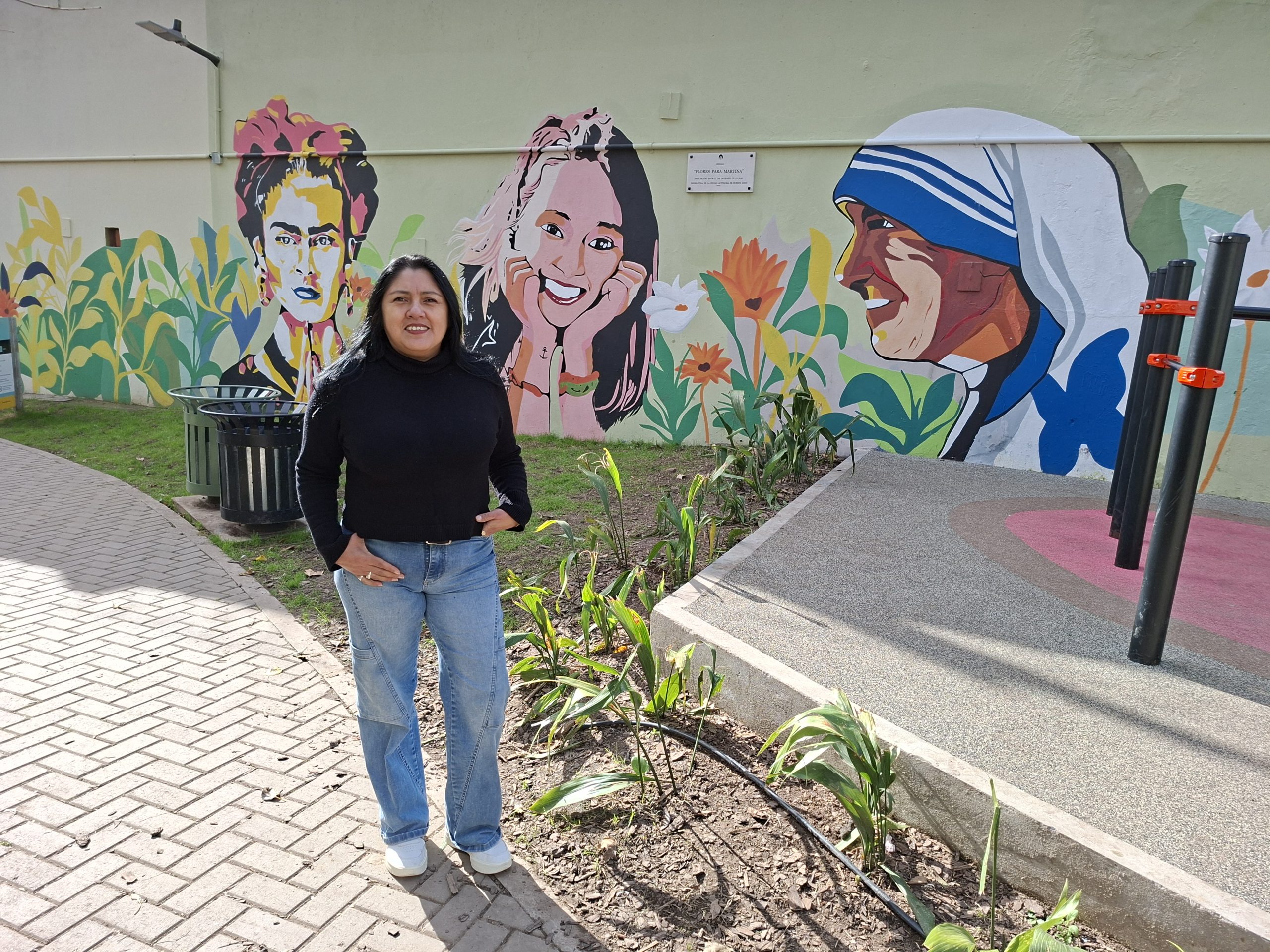 «El mural nació de la falta de justicia; dijimos qué hacemos ahora en honor de Martina; cuando la Comuna 15 nos ofrece el espacio dijimos hay que buscar artistas; la misma Comuna nos hace el vínculo con Victoria Ferreyra, que vino a conocer la plaza; en ese entonces habia pandemia, así que las plazas estaban cerradas; la conocimos desde afuera, mirando a través de la reja; estaba todo lleno de grafitis, era una plaza un poco oscura, me refiero a la pintura de las paredes».