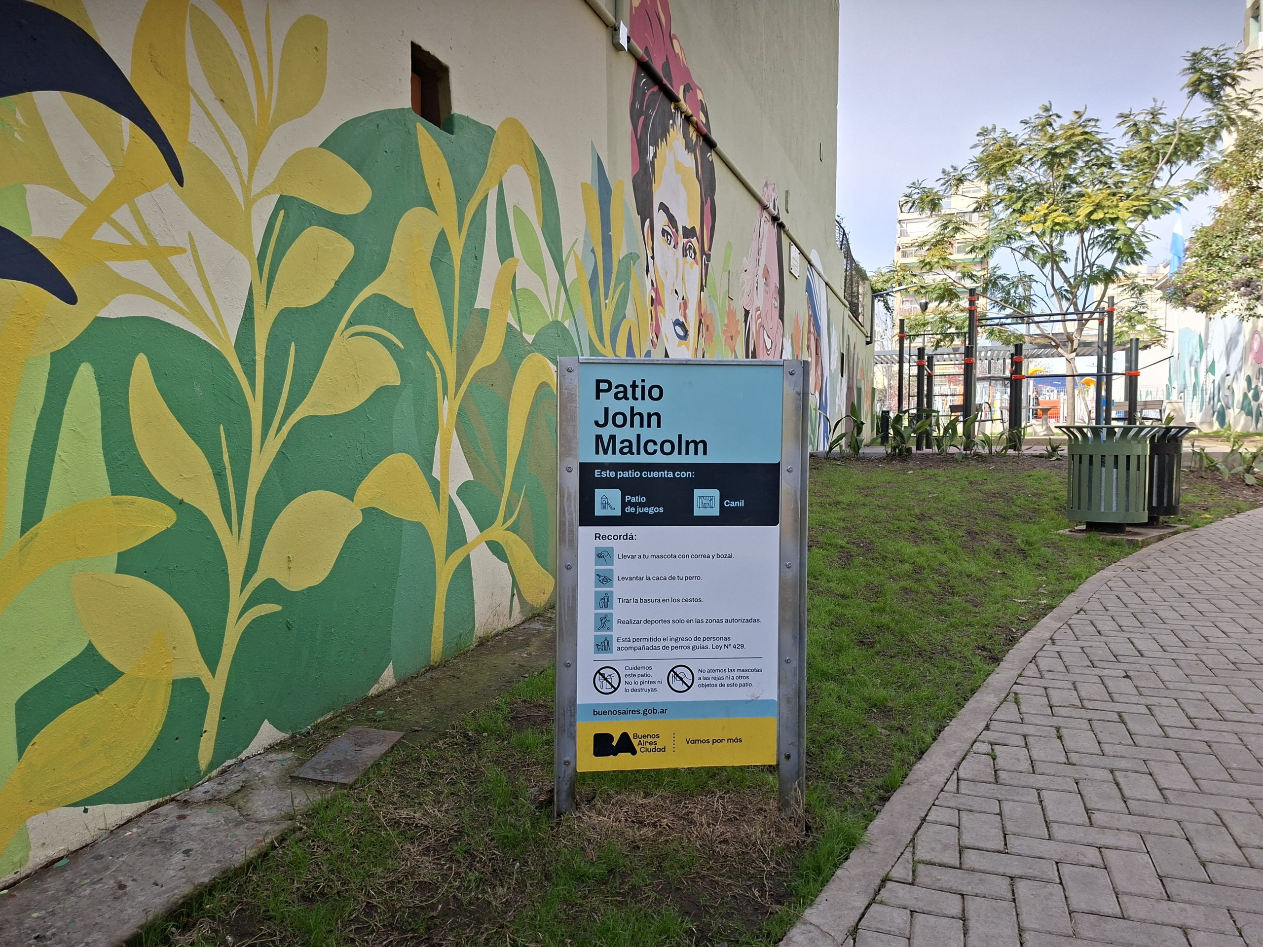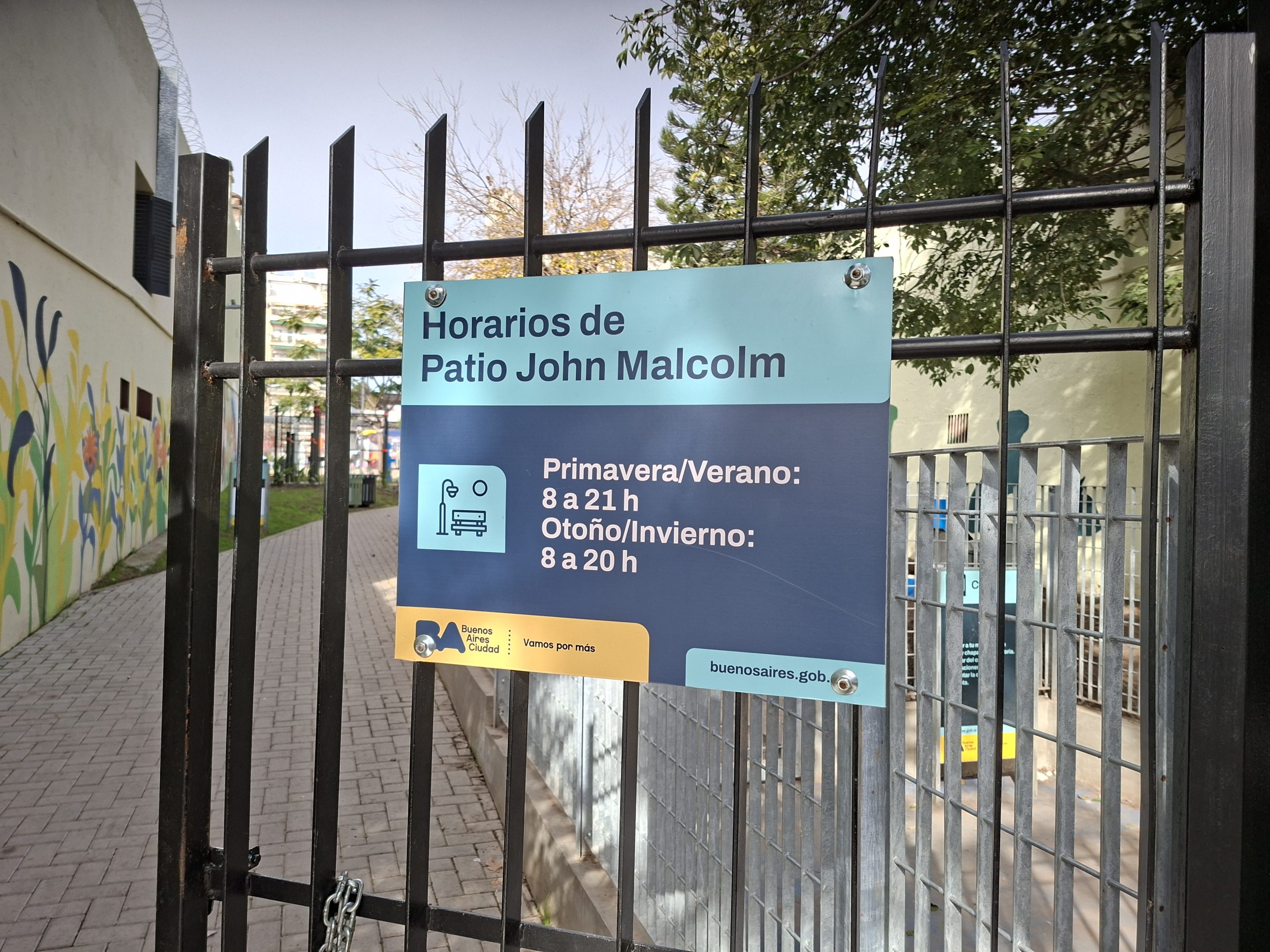 Cartel interior del Patio John Malcolm al ingresar por la calle Serrano.