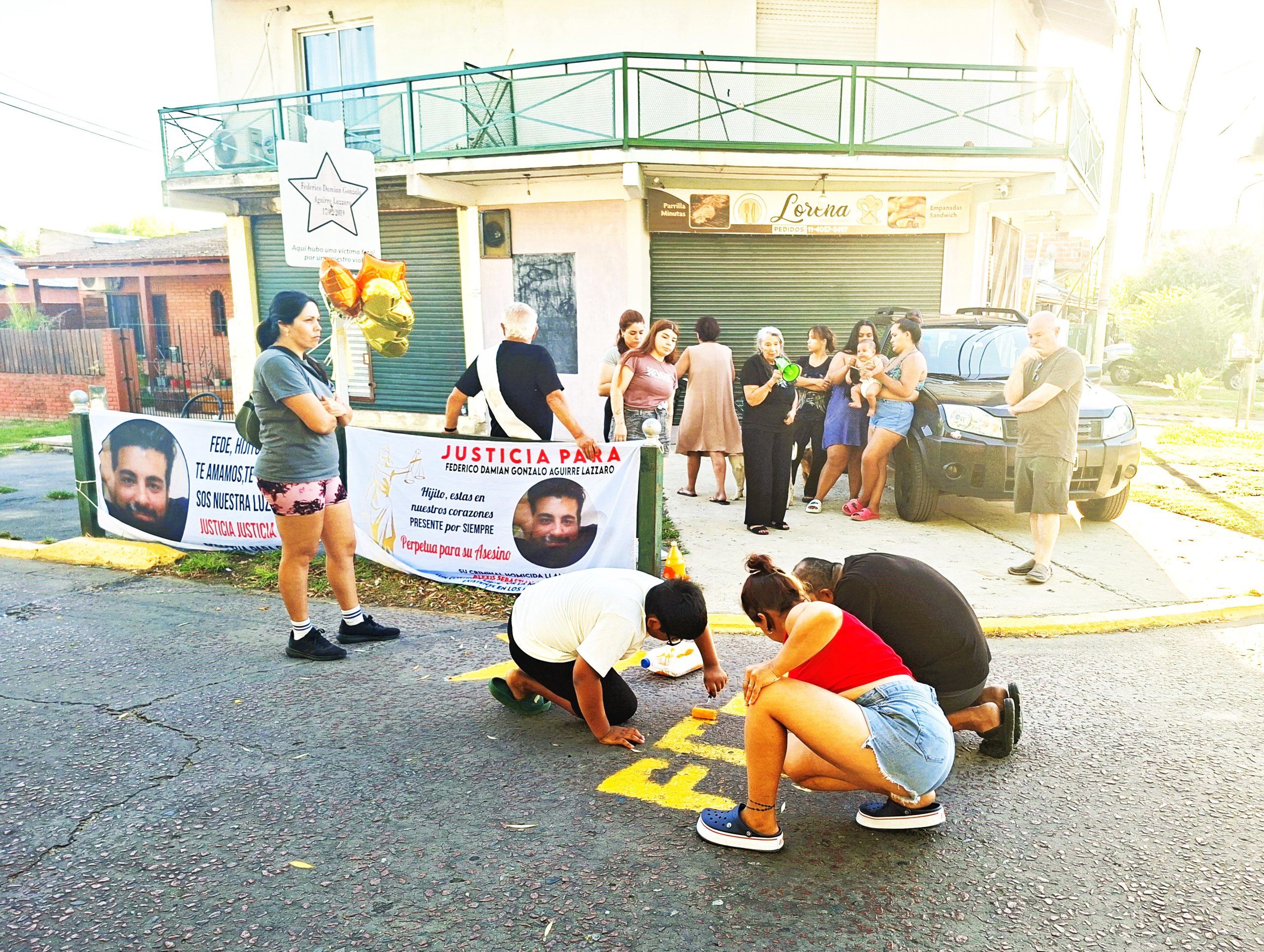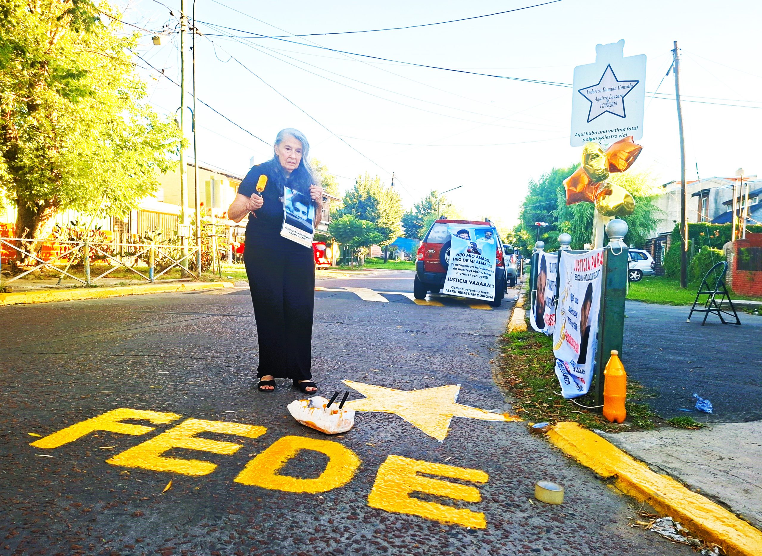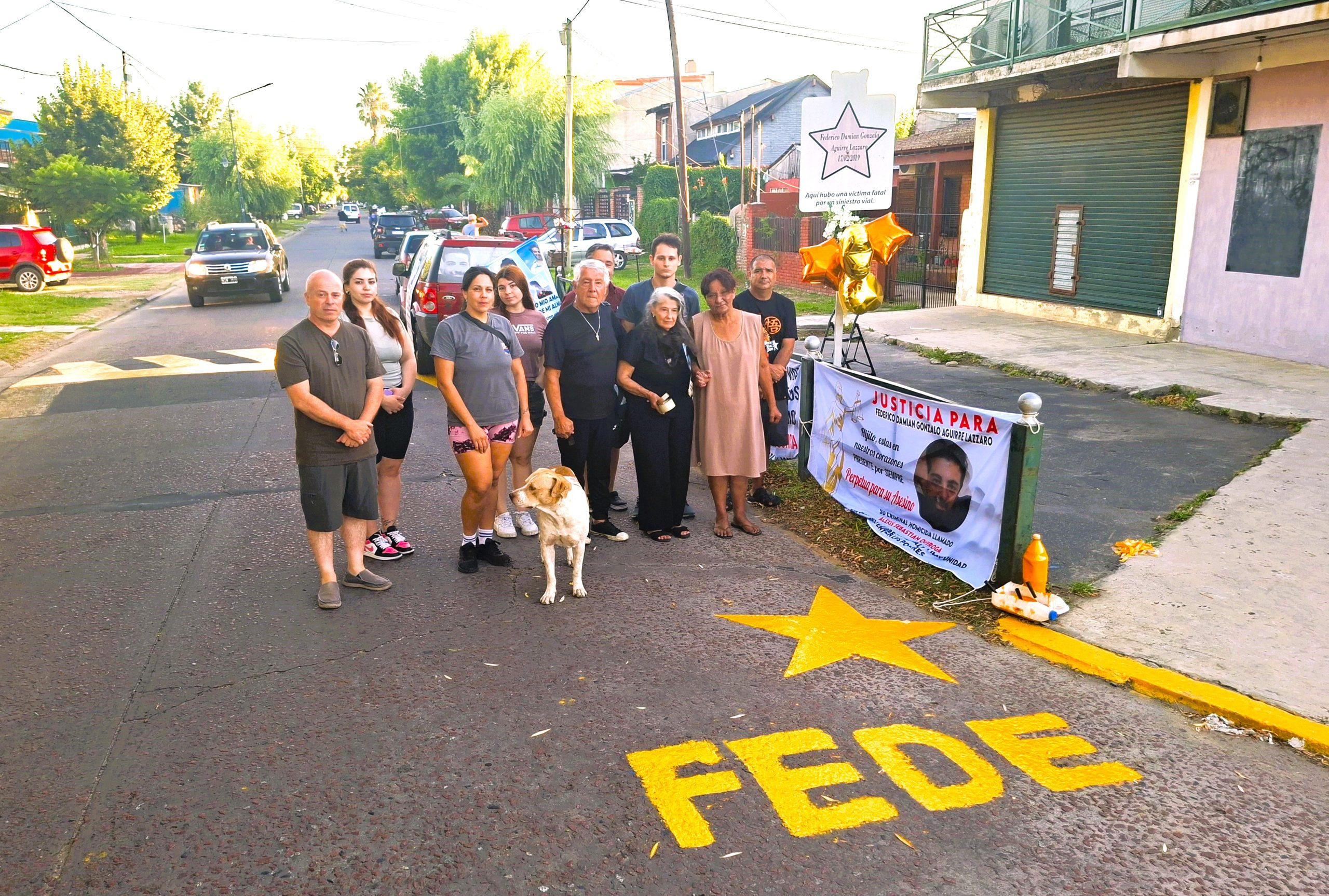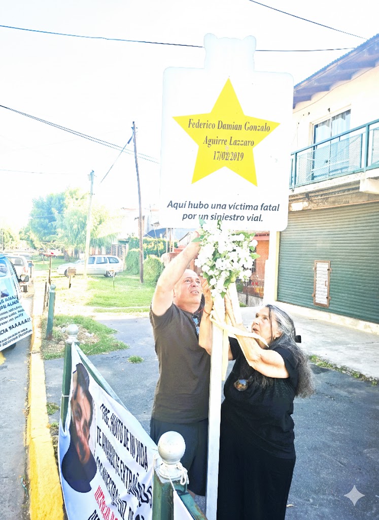 «Federico Damián Gonzalo Aguirre Lázzaro, 17/2/2019», se lee en el interior de la estrella amarilla estampada en el cartel vertical clavado junto al cordón de la vereda. «Aquí hubo una víctima fatal por un siniestro vial», reza debajo del astro de cinco puntas. El letrero de chapa se yergue junto a la intersección de las calles Ricardo Castiglioni e Ingeniero Guillermo White. Es el sitio donde Alexis Sebastián Quiroga, al volante de un automóvil, embistió de manera fatal al homenajeado, que circulaba correctamente en moto. El Chapu, apodo del victimario, iba alcoholizado y notoriamente excedido de velocidad.