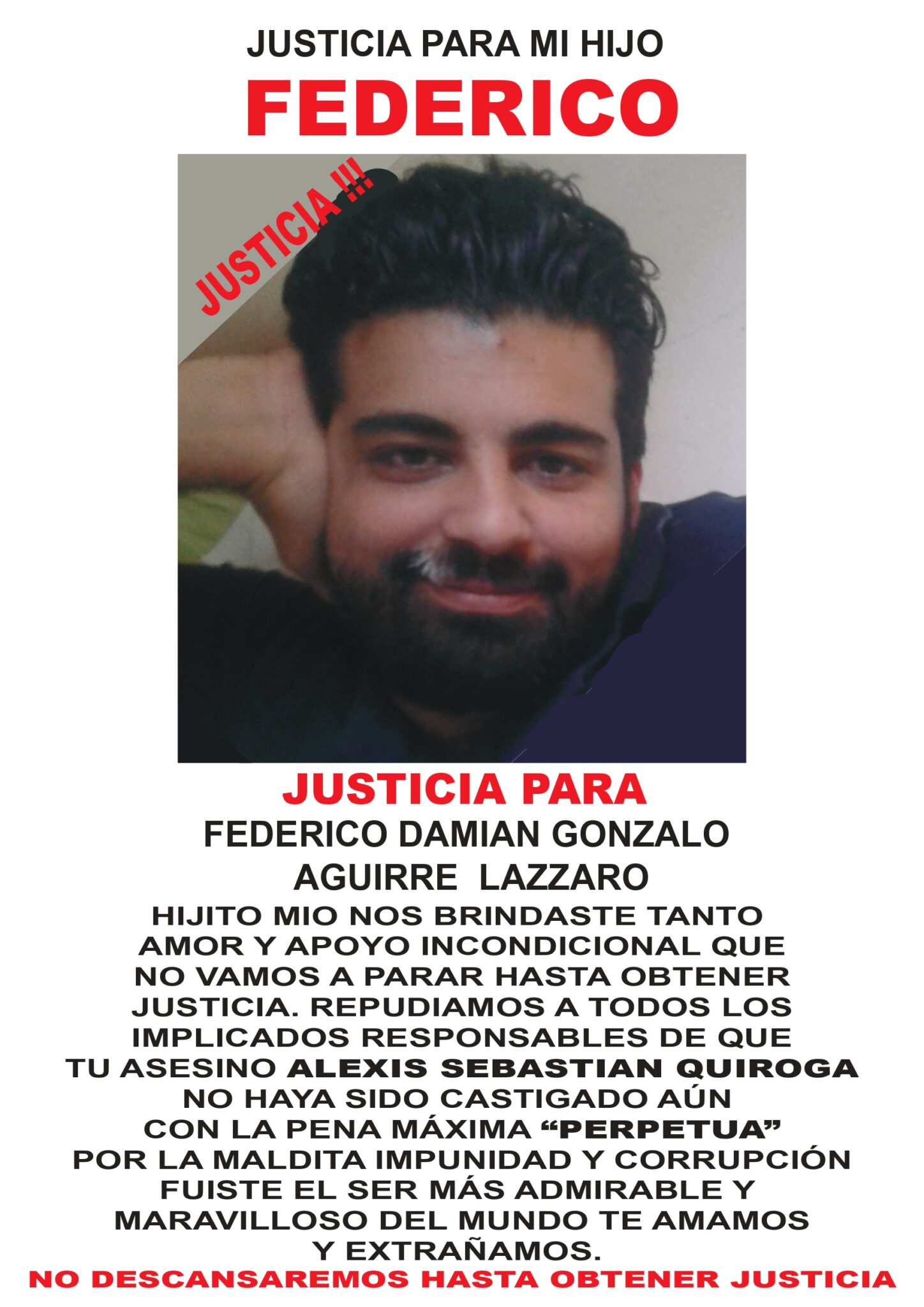 «El sumario de Federico tenía la carátula homicidio simple con dolo como hecho principal y homicidio culposo subsidiariamente; a pesar de tener todo probado y comprobado…; todas las incongruencias, todas las barbaridades…; iba sin luces, alcoholizado, a extremísima velocidad (tres veces superior a la mínima)…; no frenó, no esquivó…; [tenía otras] causas penales…; un desastre; mi hijo le salvó la vida a gente que estaba en la parrilla [inmediata el sitio del impacto]; sirvió como escudo humano; lo destrozó; homicidio simple implica de ocho a 25 años de prisión; los jueces garantistas le dieron cinco».